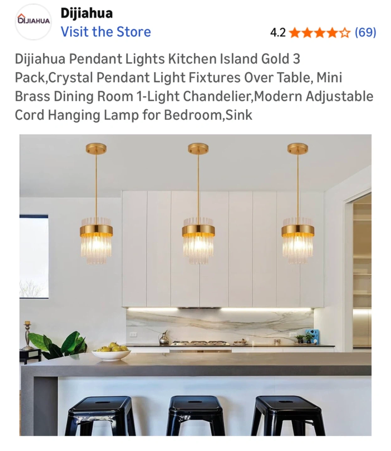 Selling a set of Dijiahua Pendant Lights for your kitchen island! This set comes with 3 lights, perfect for over a table or kitchen island. They feature a modern adjustable cord hanging design, ideal for a bedroom or sink area. The lights have a mini brass dining room 1-light chandelier style, and they come in a gold 3-pack color. Retail $119.
