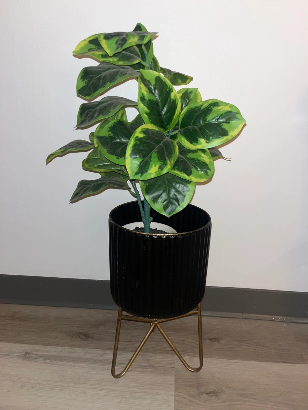 Selling a faux fiddle leaf fig tree in a stylish black and gold pot. It's in great condition and ready to add a touch of greenery to your space!
