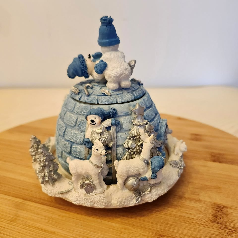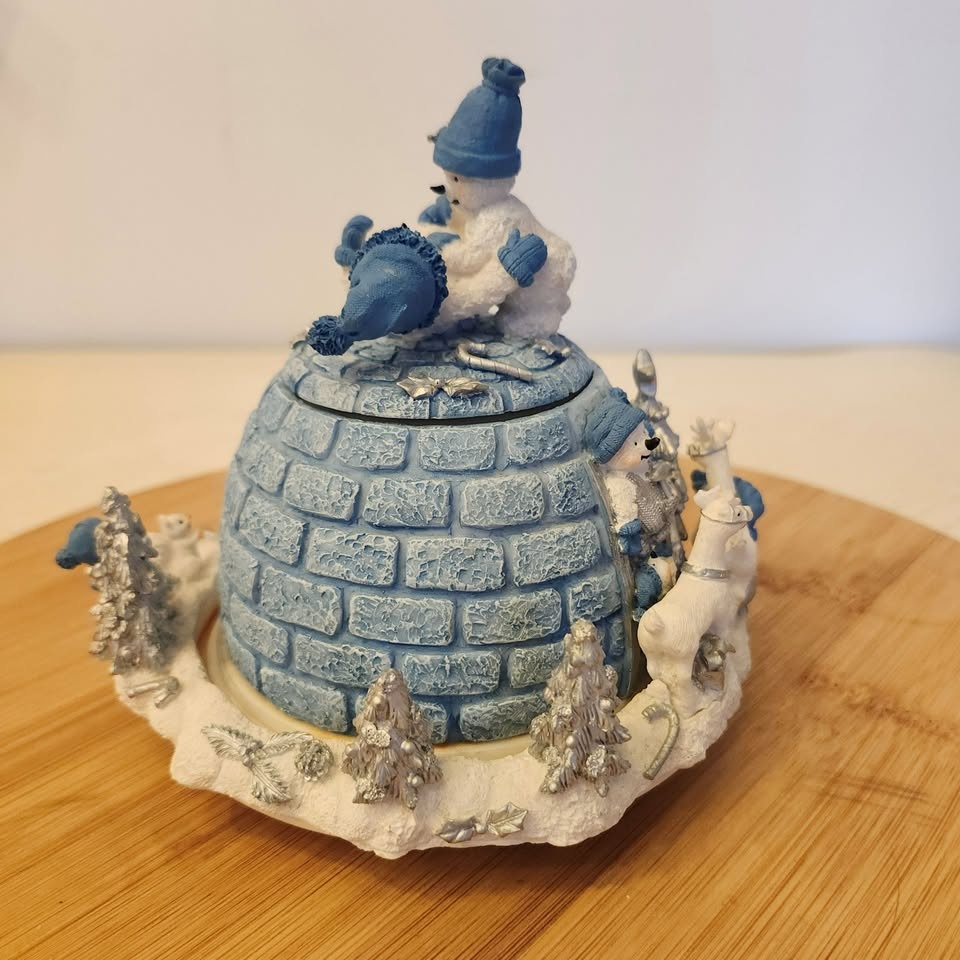 A wonderful and whimsical music box for Christmas. Features snowmen playing on top of a blue igloo along with reindeer, Christmas trees and other themed items. It has a wonderful tone which plays with winding up. View the video to hear it.