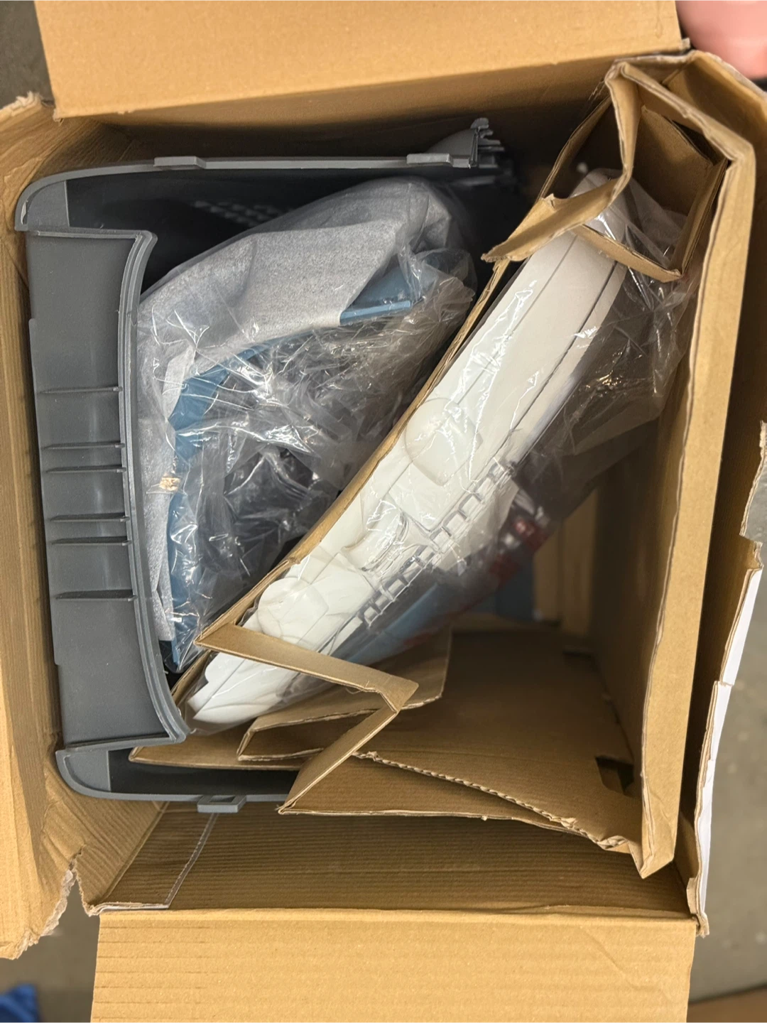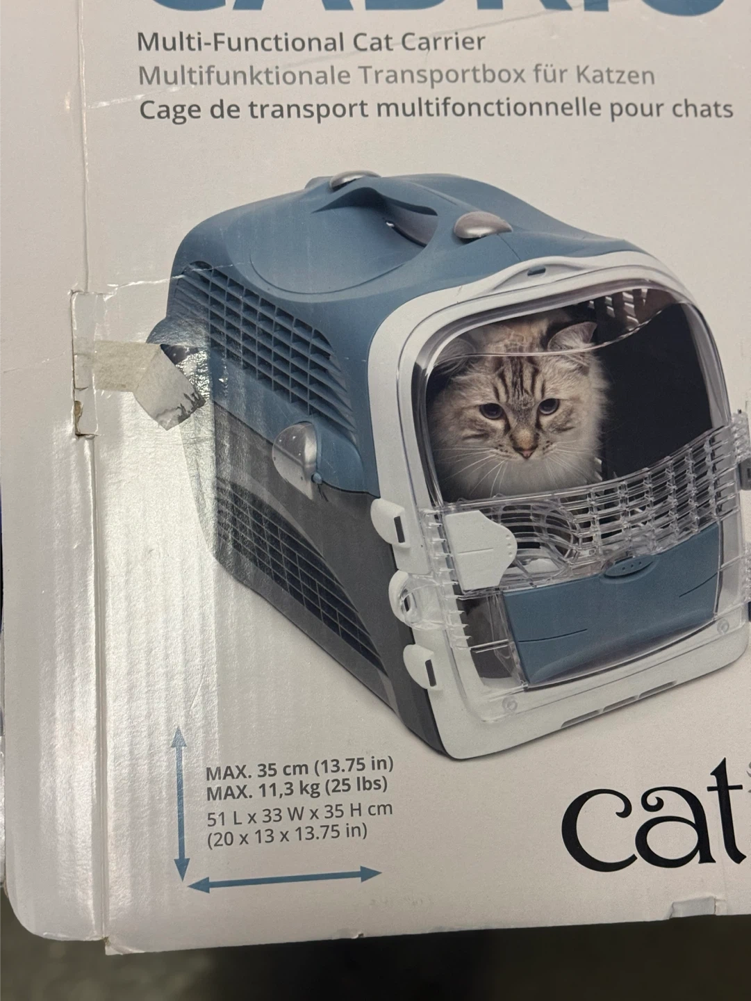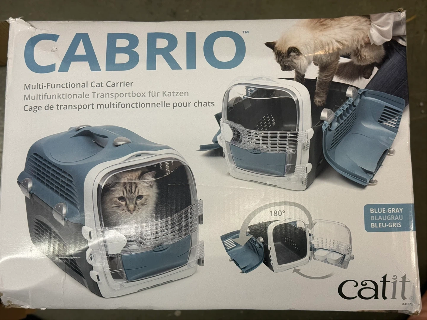 Selling a Catit Cabrio multi-functional cat carrier in blue-gray! This carrier is designed for the safety and comfort of your furry friend. It's new and comes with the original box. ( box is damaged)