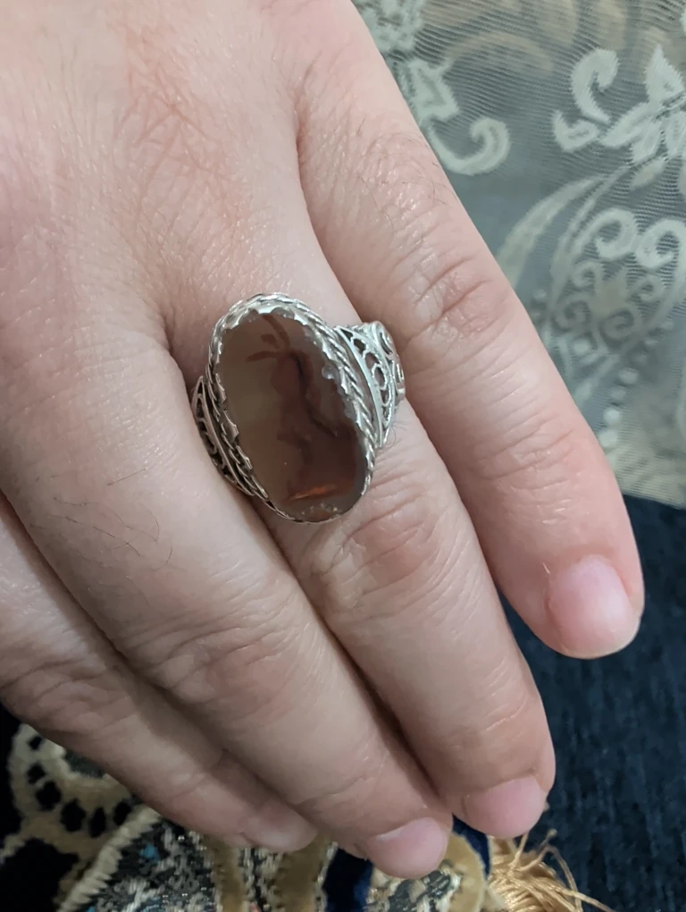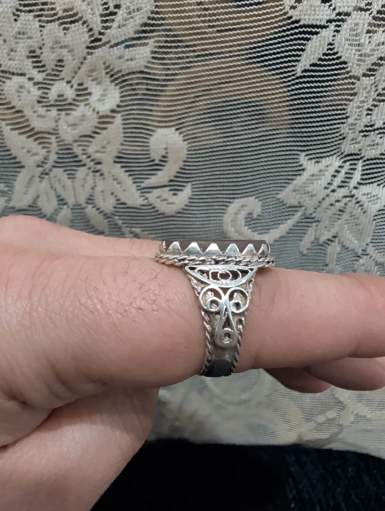 Selling a vintage ring. It features a unique stone set in a detailed silver-tone band. It would make a lovely addition to any jewelry collection!