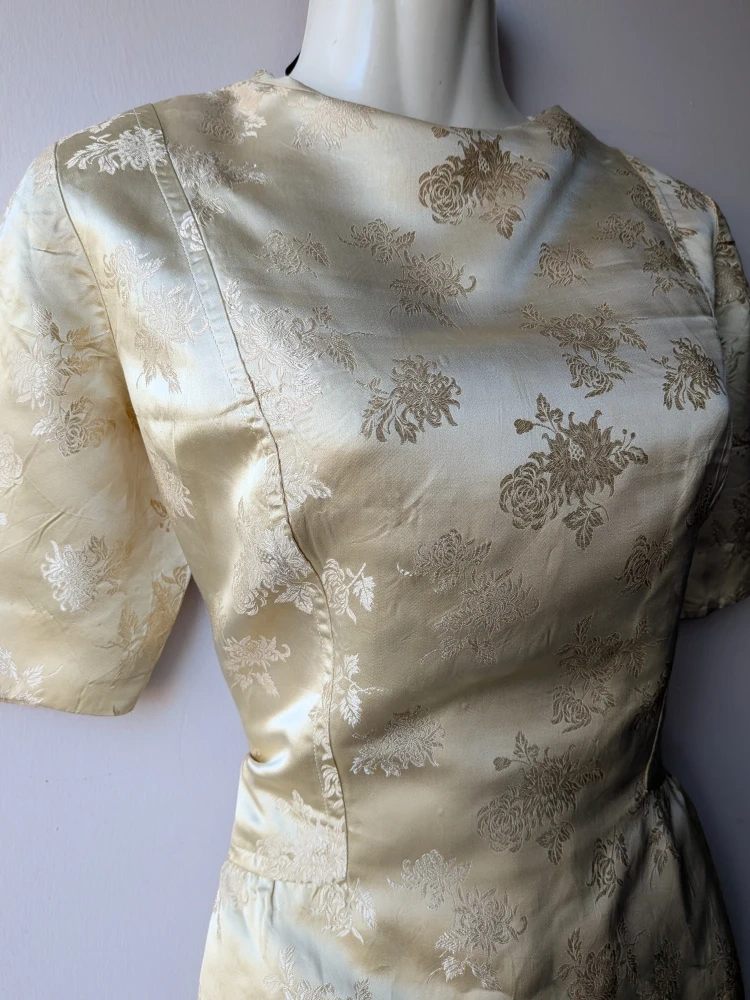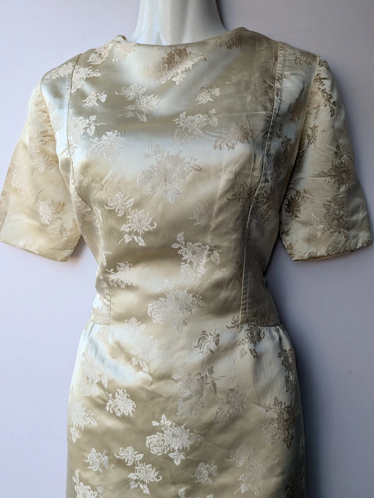 A lovely vintage gold dress with a floral pattern. It has short sleeves and a zipper in the back. The material has a slight sheen and satin feel to it. No lining