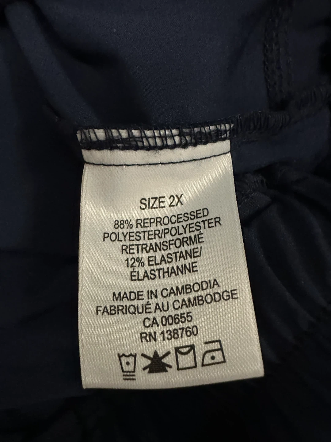 I'm selling a pair of navy blue cargo pants in size 2X. They are made of 88% reprocessed polyester and 12% elastane. Perfect for everyday wear!