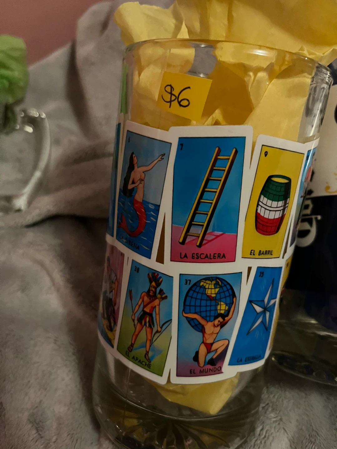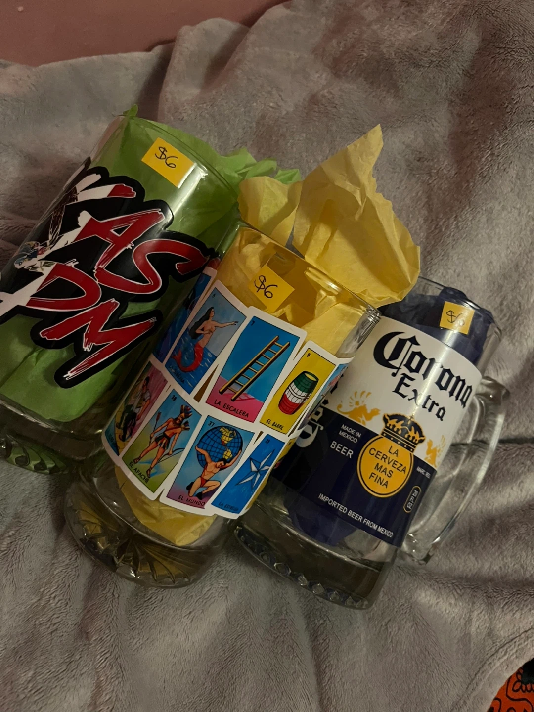Selling glass cups One has a Loteria theme and the other is a Corona Extra beer glass and the other one says “TRAKAS HDSPM” They're all in great shape and ready for your next fiesta or get-together