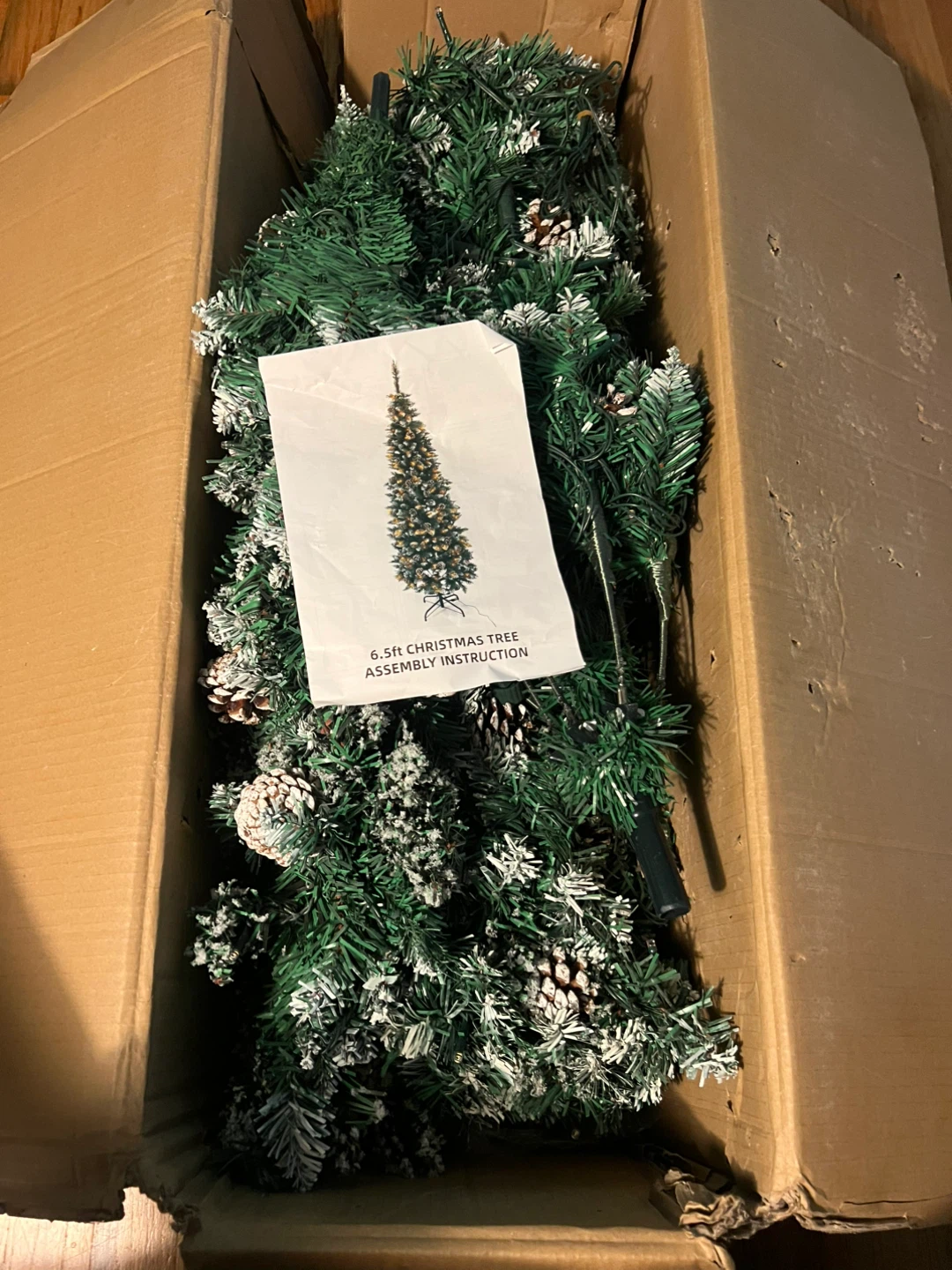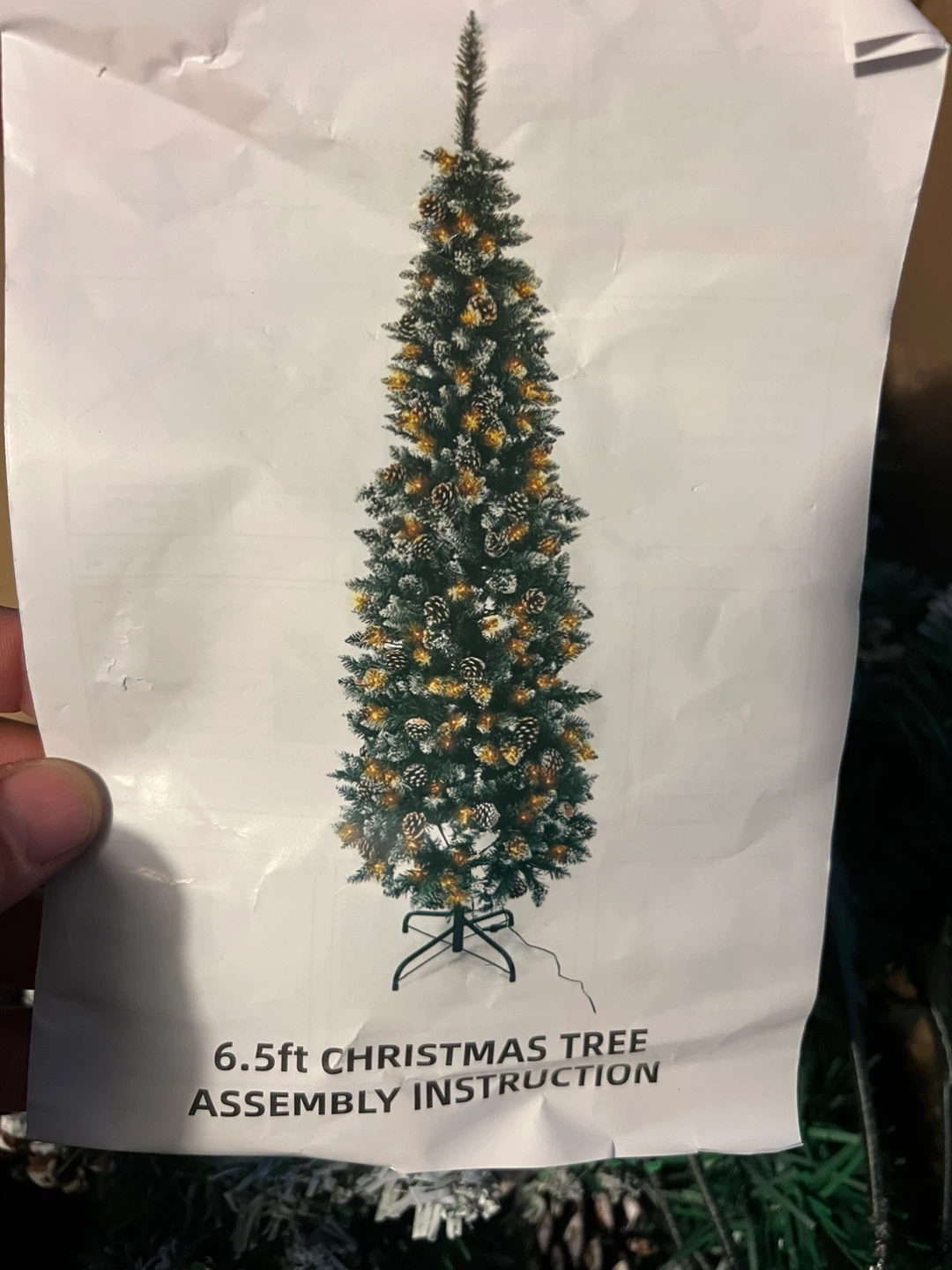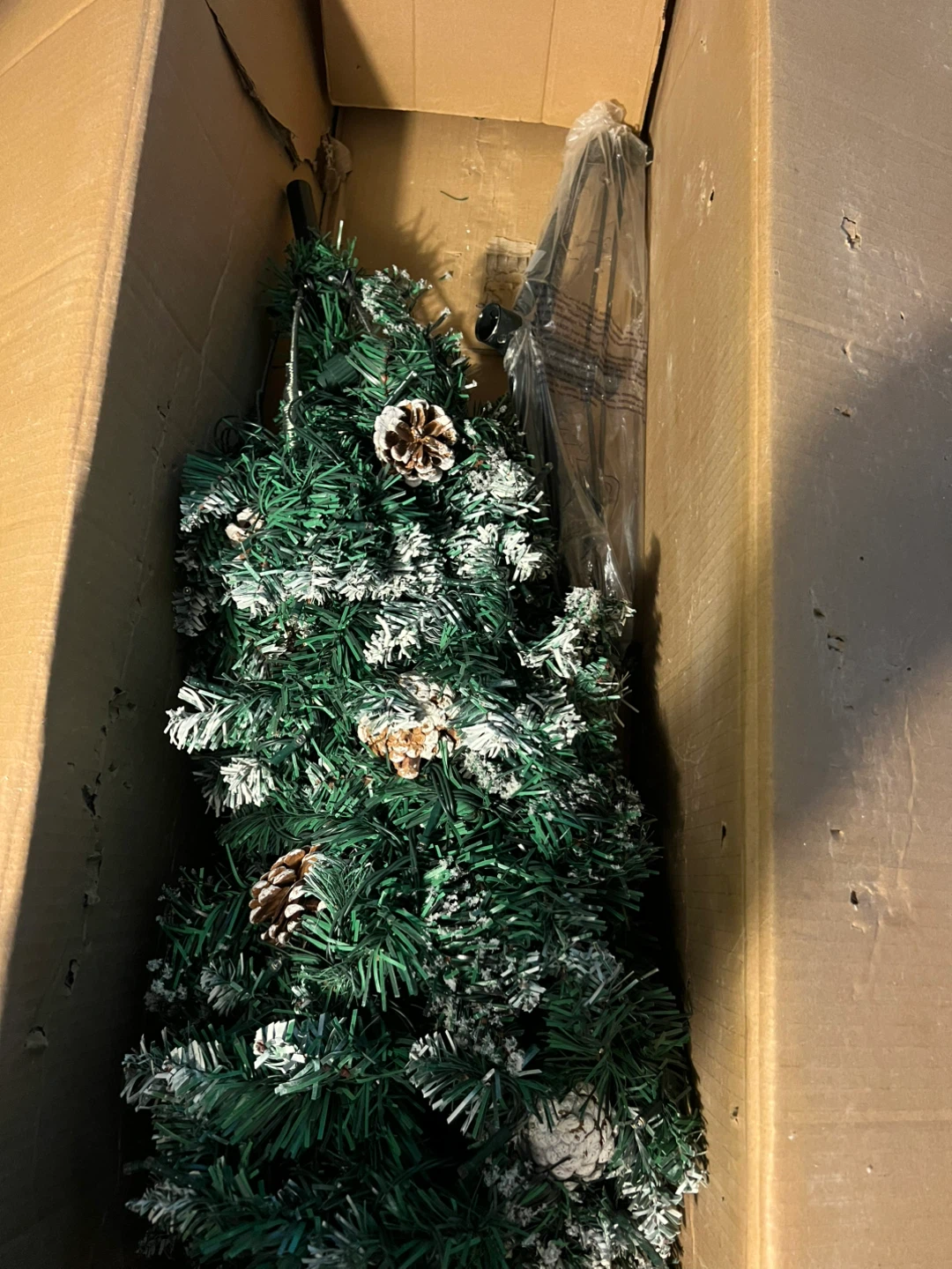 Selling a 6.5ft Christmas tree! It comes with lights and pinecones already attached. The tree is in great condition and includes the assembly instructions. It's all packed up in its original box for easy transport