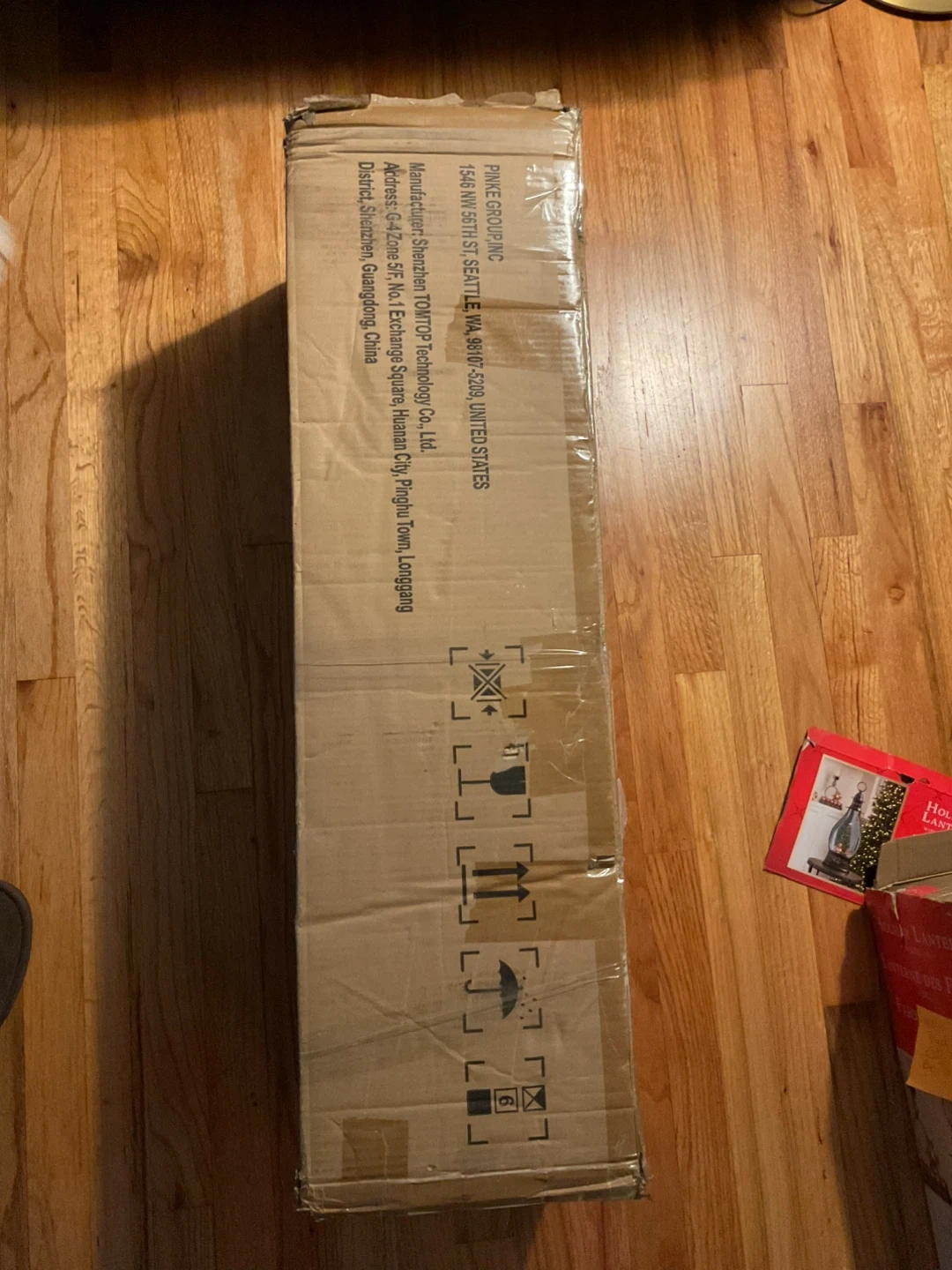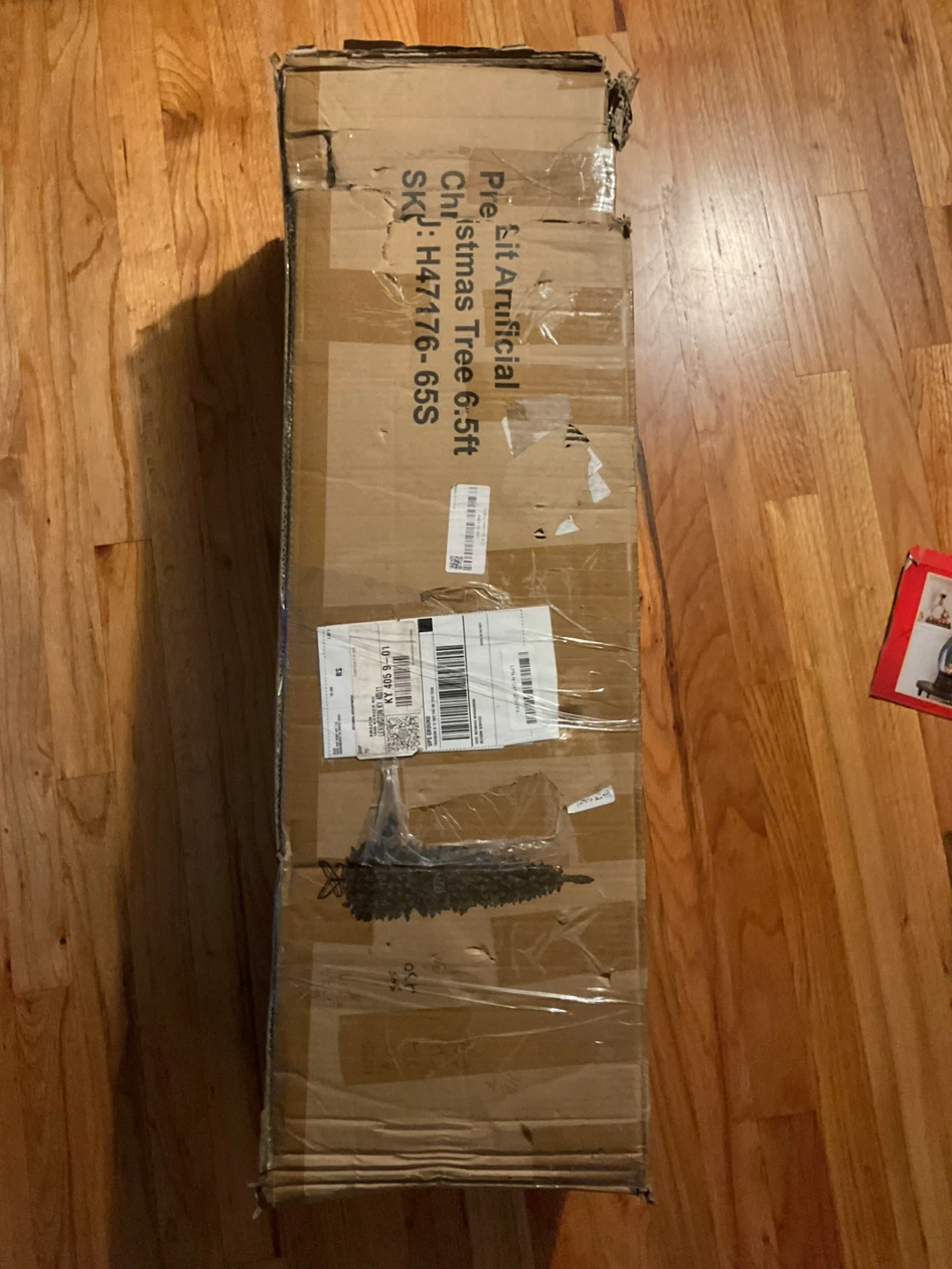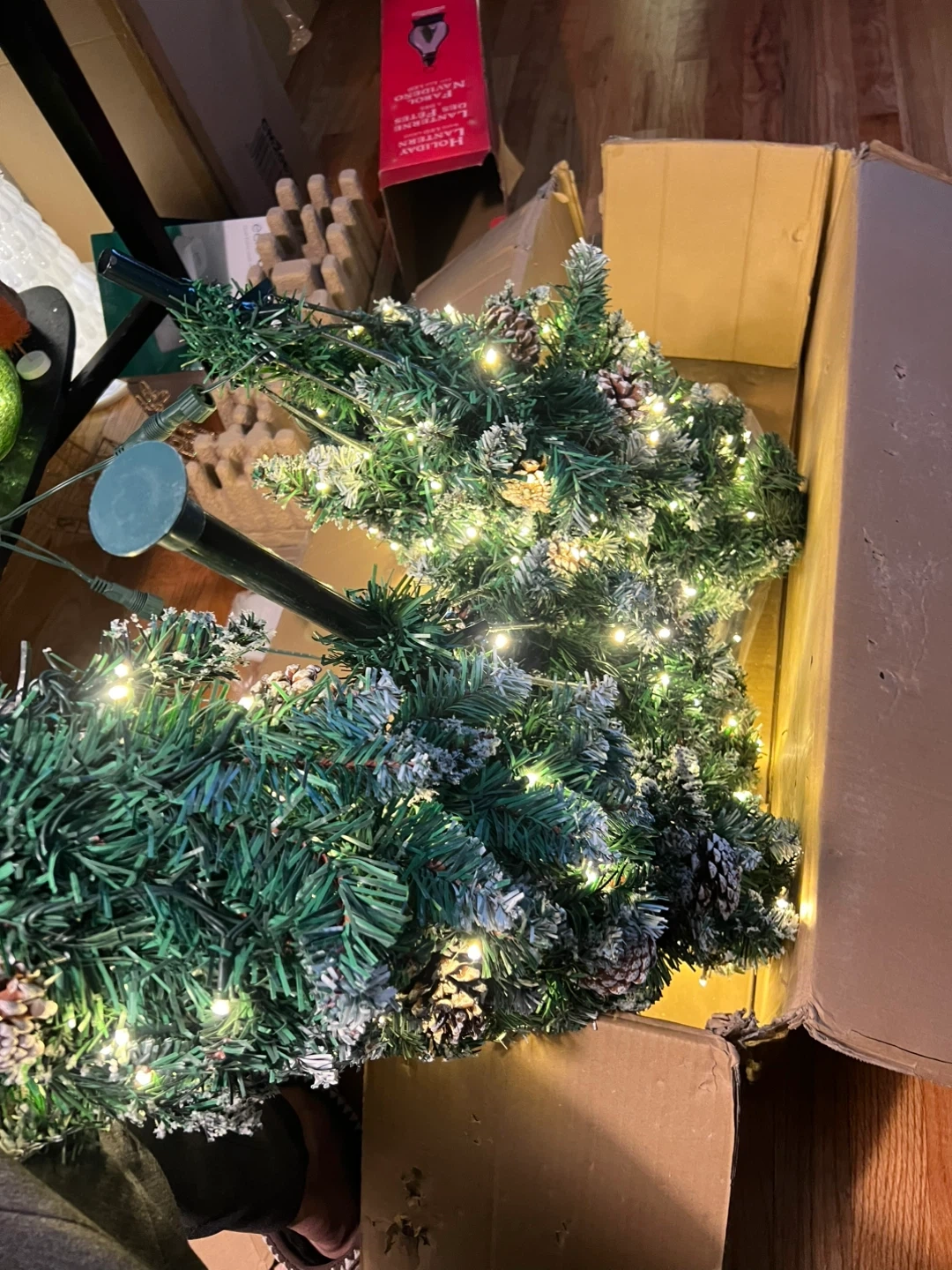 Selling a 6.5ft Christmas tree! It comes with lights and pinecones already attached. The tree is in great condition and includes the assembly instructions. It's all packed up in its original box for easy transport