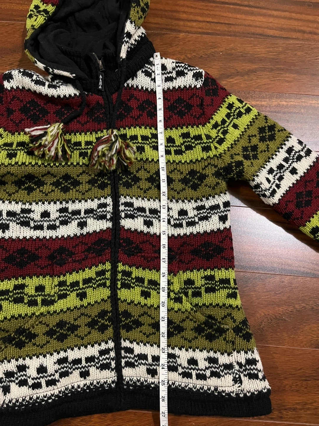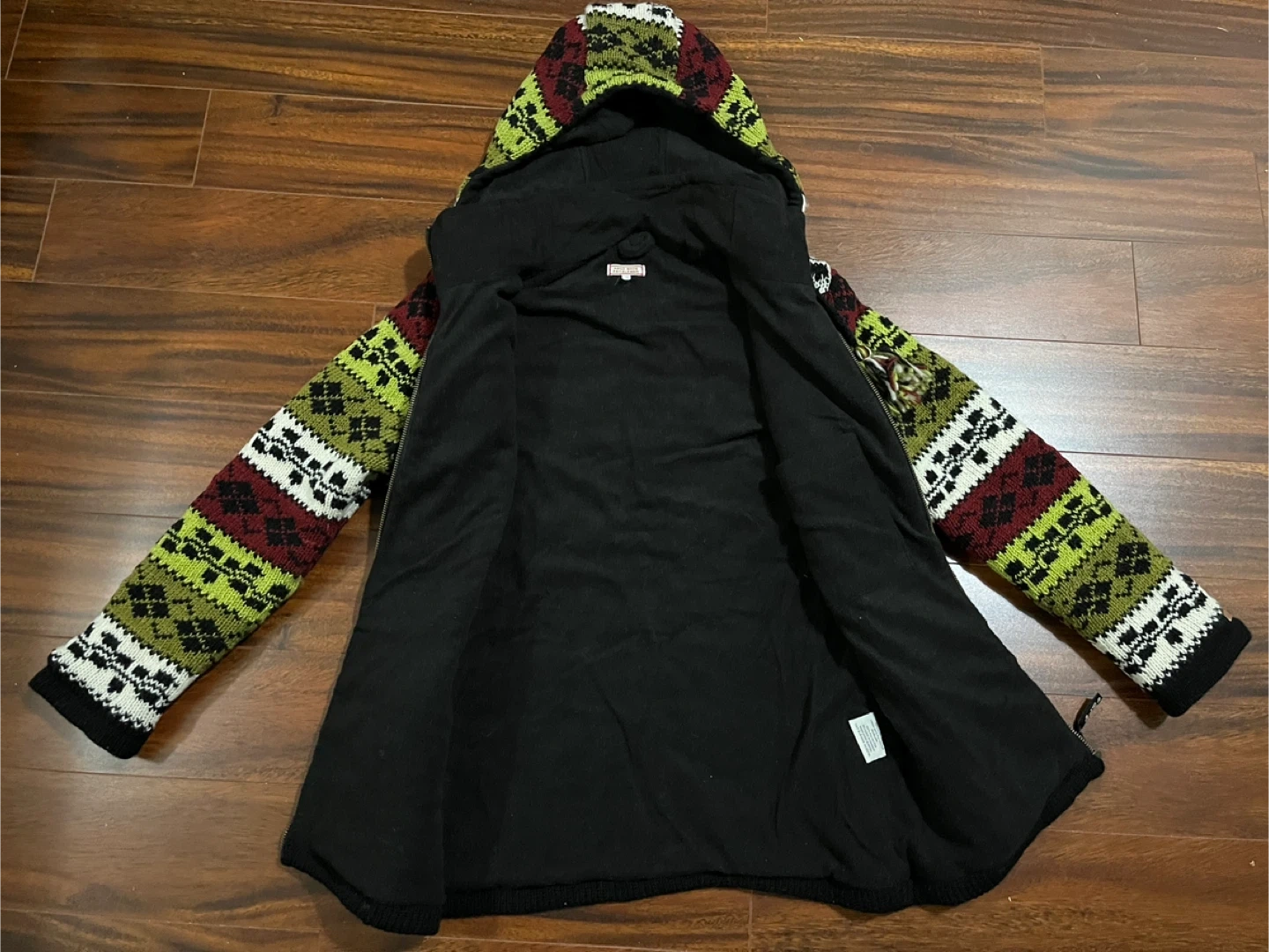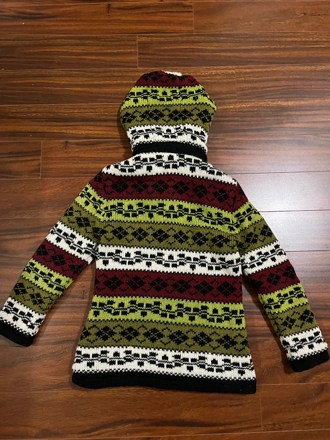 Alma women’s small hand knitted wool sweater jacket in excellent condition. Nordic style fair isle pattern in olive green, cream, black and deep red. Zipper closure, removable hood with pom poms, two side pockets and inner pocket. Designed in Canada. Hand knitted in Nepal under Fair Trade conditions. 100% wool exterior, polar fleece lining. Originally $240.