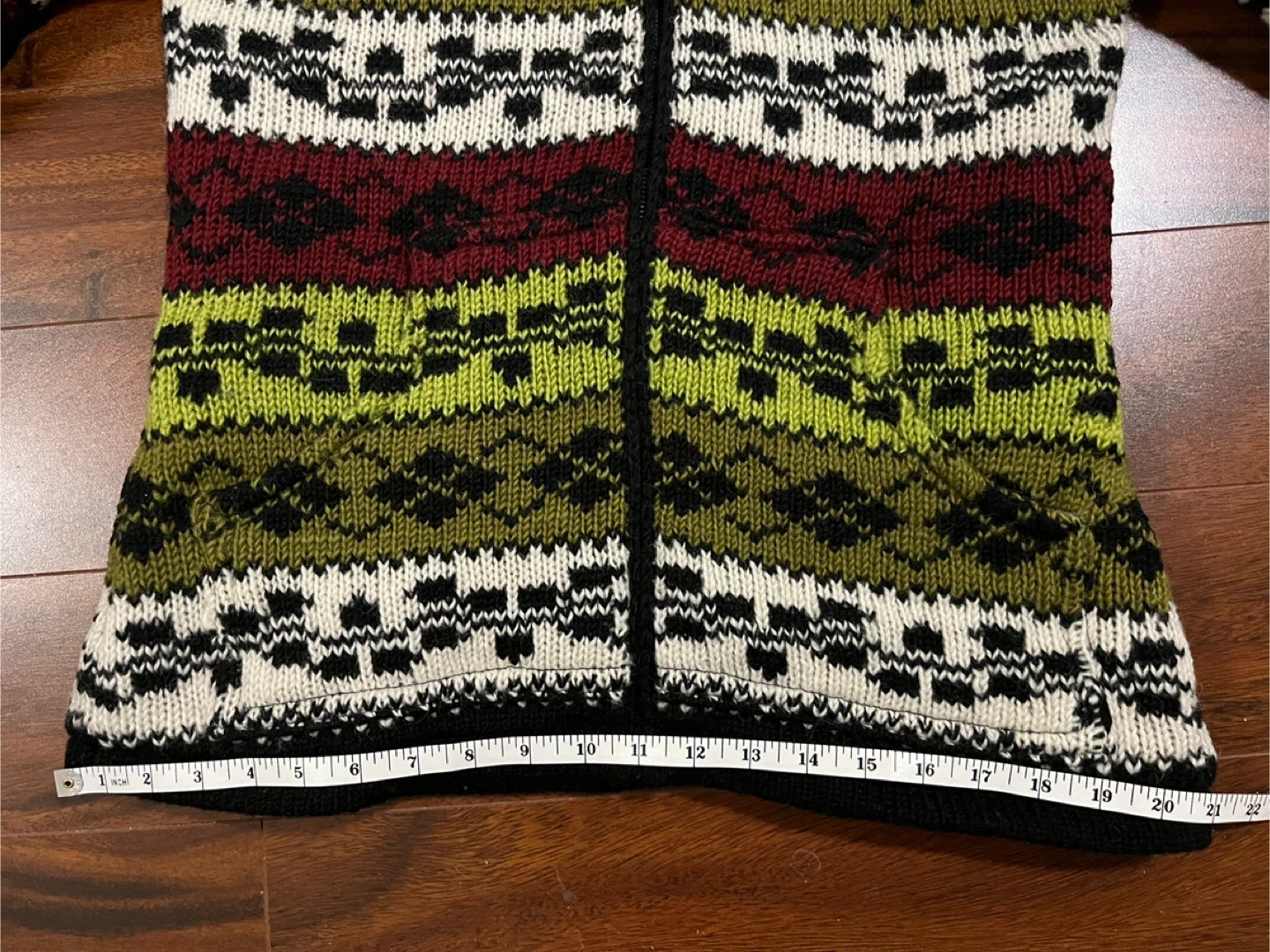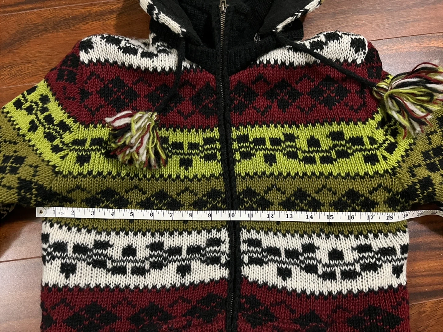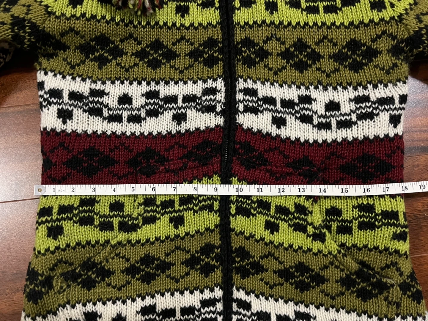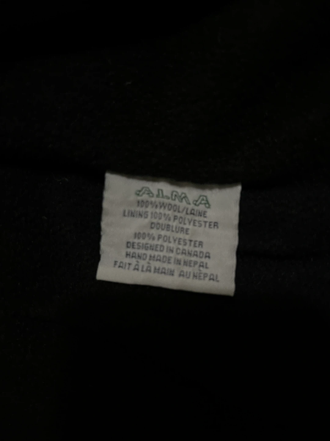 Alma women’s small hand knitted wool sweater jacket in excellent condition. Nordic style fair isle pattern in olive green, cream, black and deep red. Zipper closure, removable hood with pom poms, two side pockets and inner pocket. Designed in Canada. Hand knitted in Nepal under Fair Trade conditions. 100% wool exterior, polar fleece lining. Originally $240.