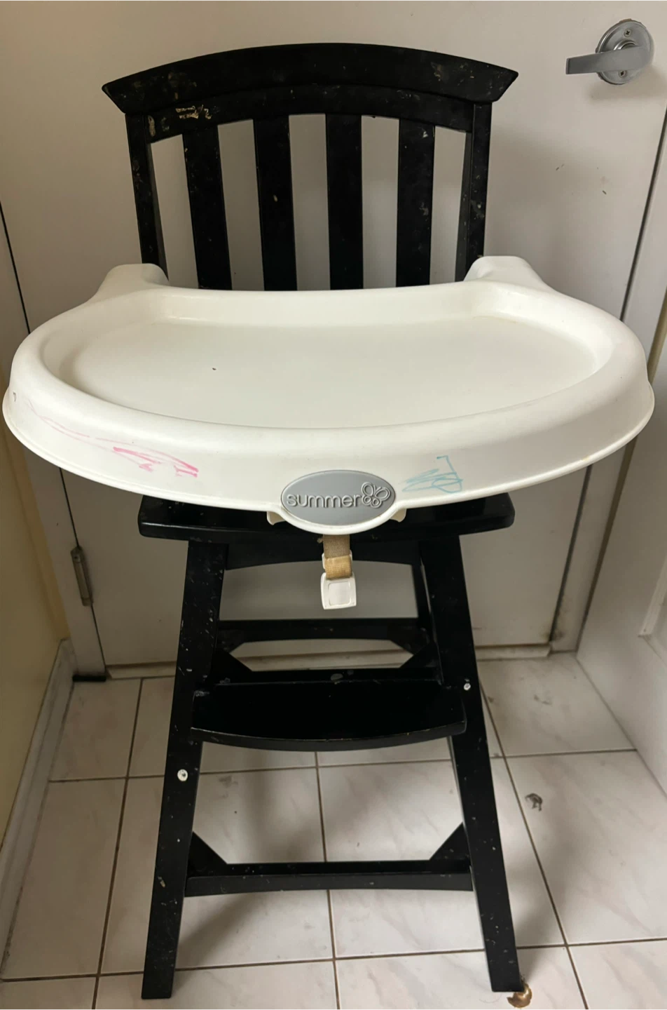 I'm giving away an Infant high chair in black. It's perfect for little ones. It has some signs of use, but it's still in good working condition.