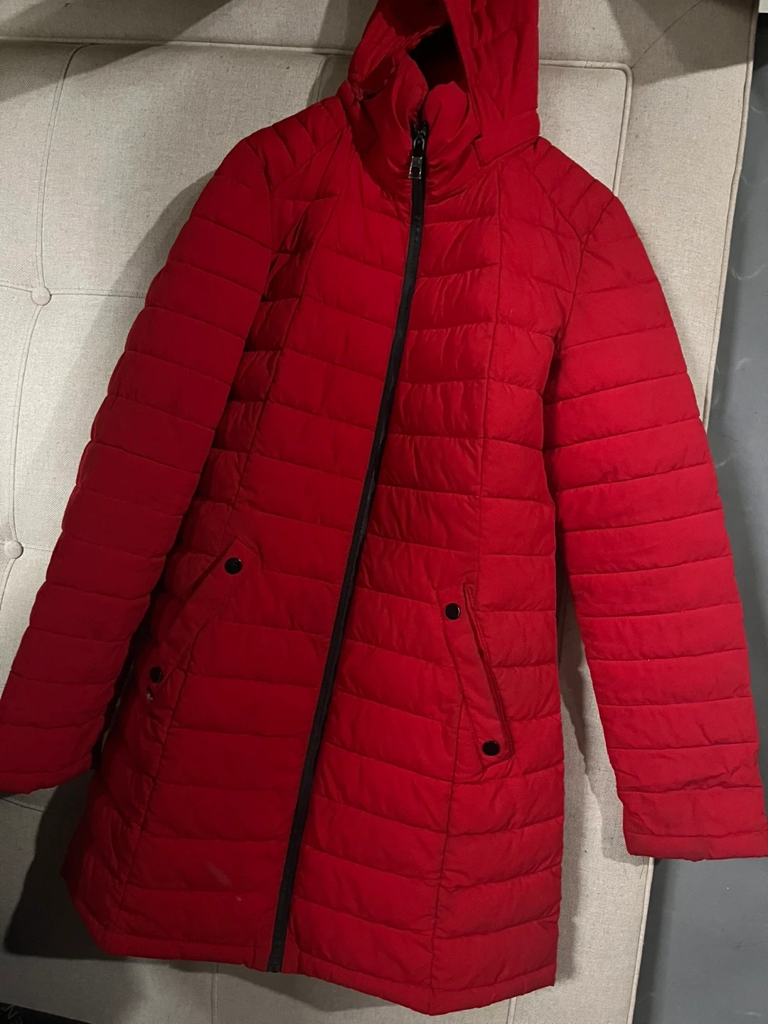 Here's a lovely red quilted puffer coat! It's perfect for staying warm during the colder months. It has a hood and a zipper closure, plus some handy pockets. It's in great condition and ready for a new owner!