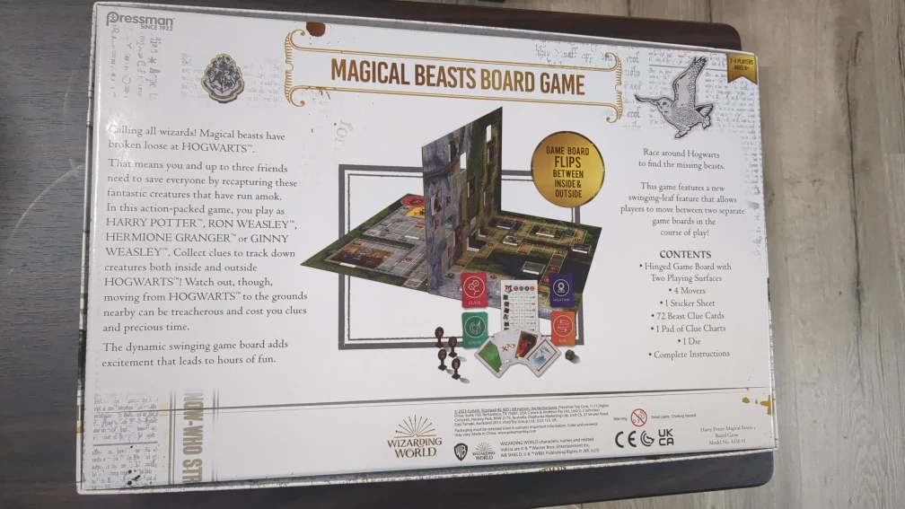Selling a Harry Potter Magical Beasts board game by Pressman. It's in great shape and comes with all the pieces and instructions. The game board flips between inside and outside locations, adding a fun twist to gameplay! It includes a hinged game board with two playing surfaces, 4 movers, a sticker sheet, 72 beast clue cards, a pad of clue charts, and complete instructions