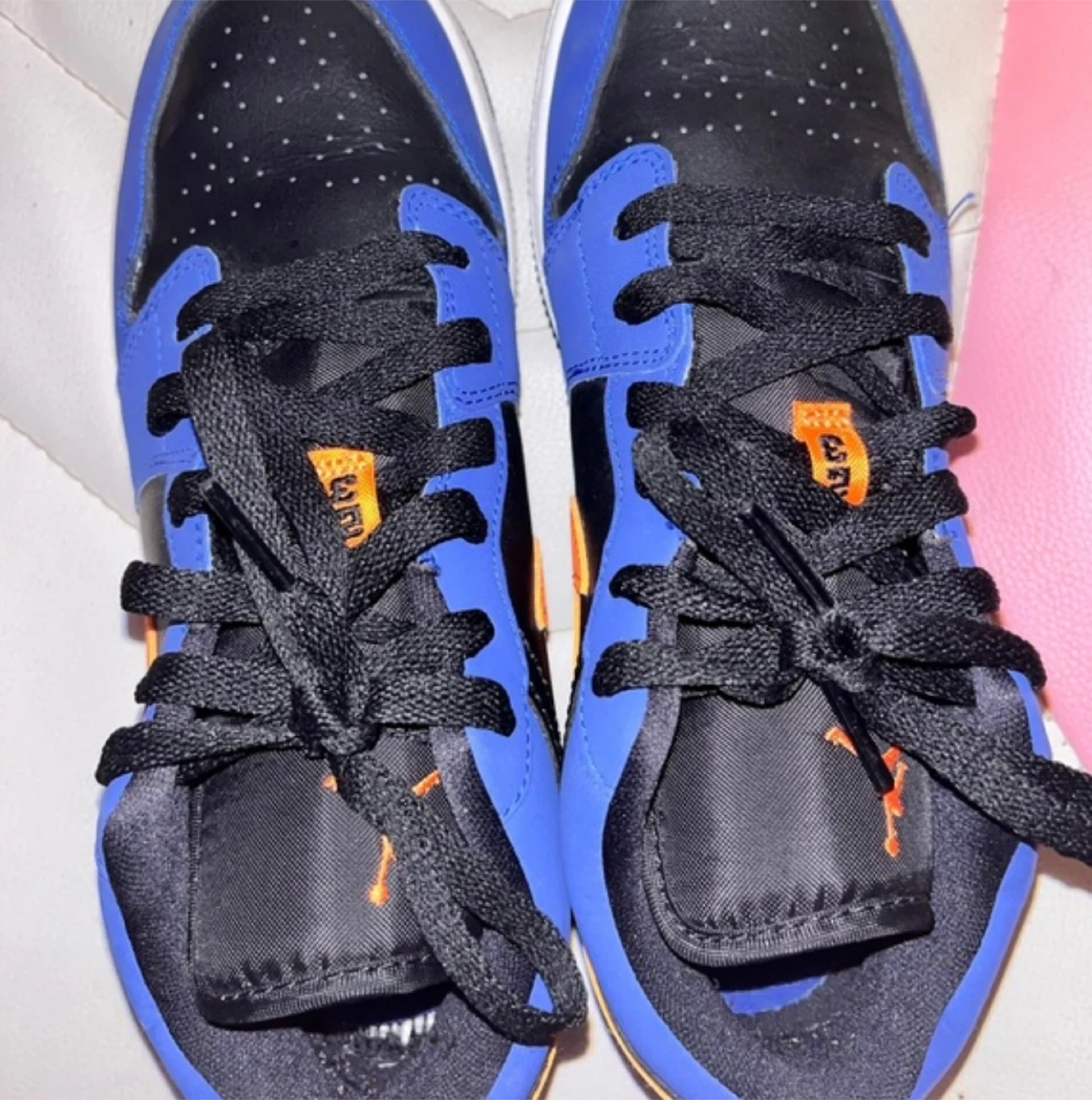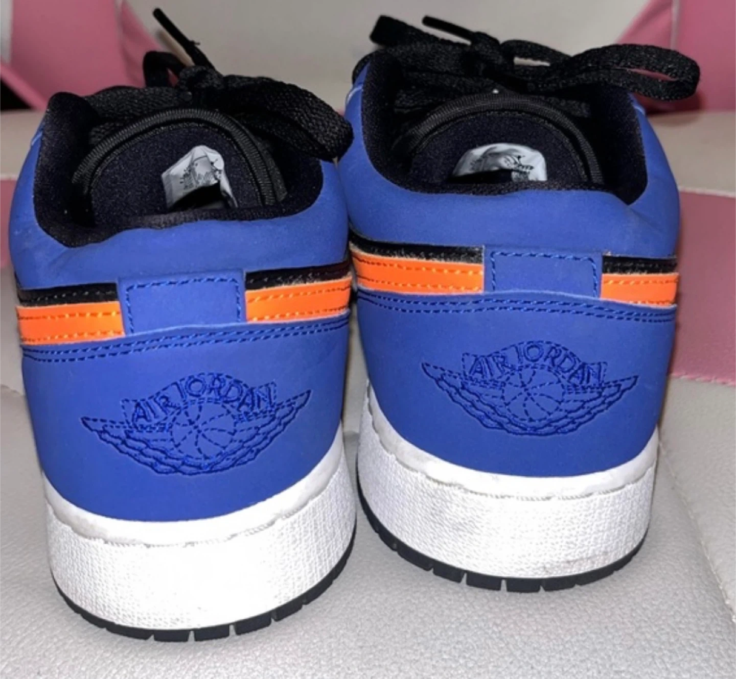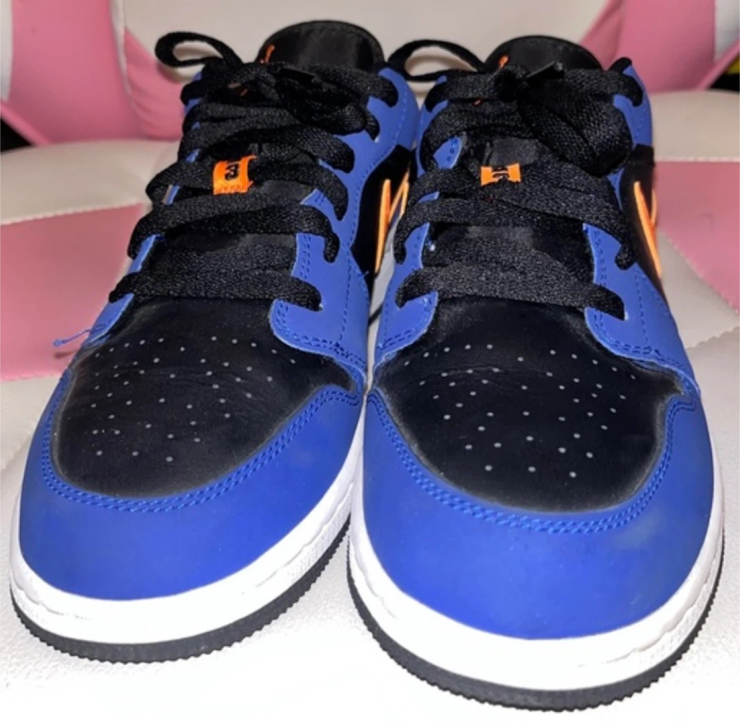 Air Jordan 1 Low shoes in blue, black, and orange. These are in great condition and ready for a new owner! Feel free to reach out if you have any questions!