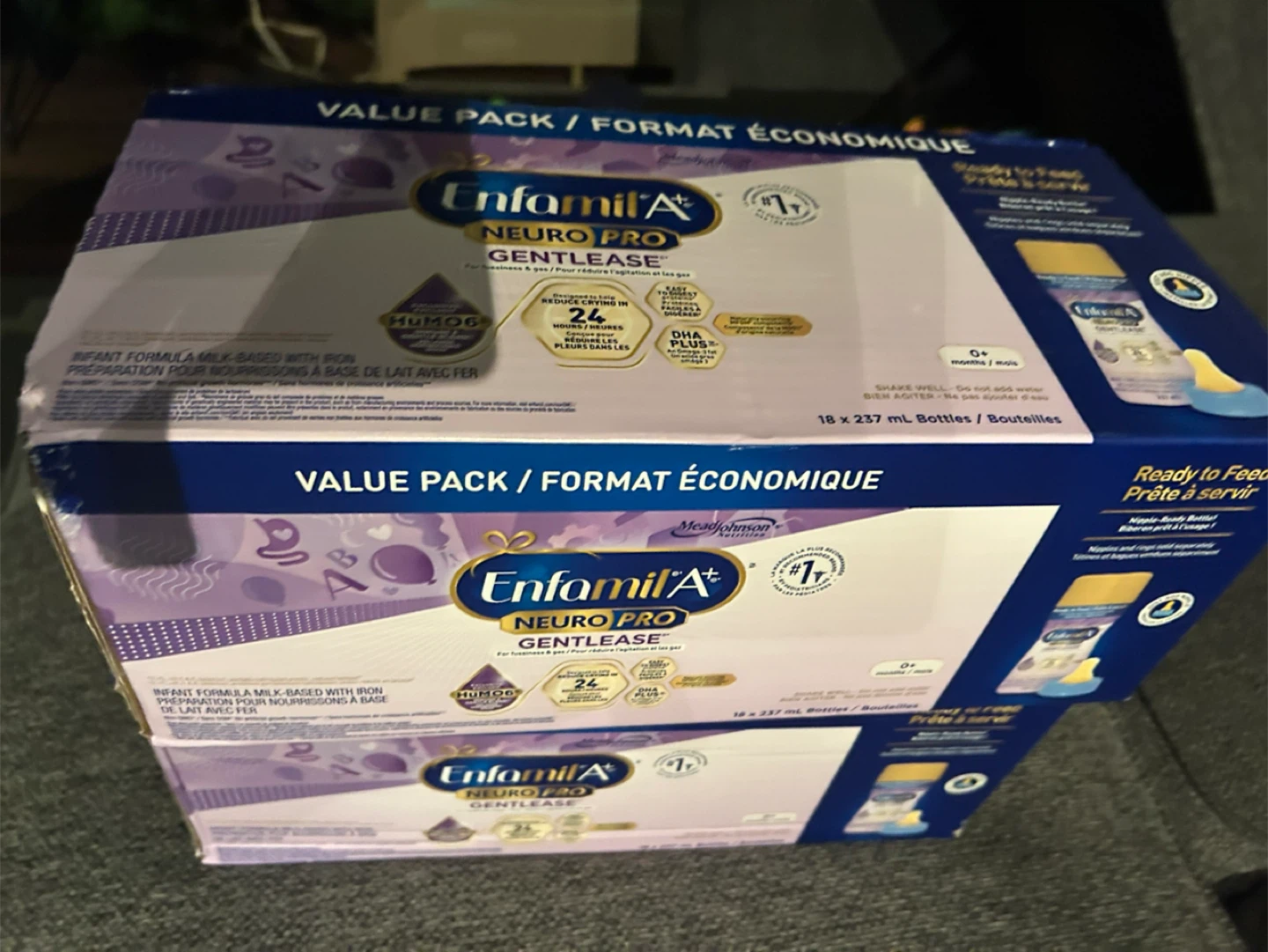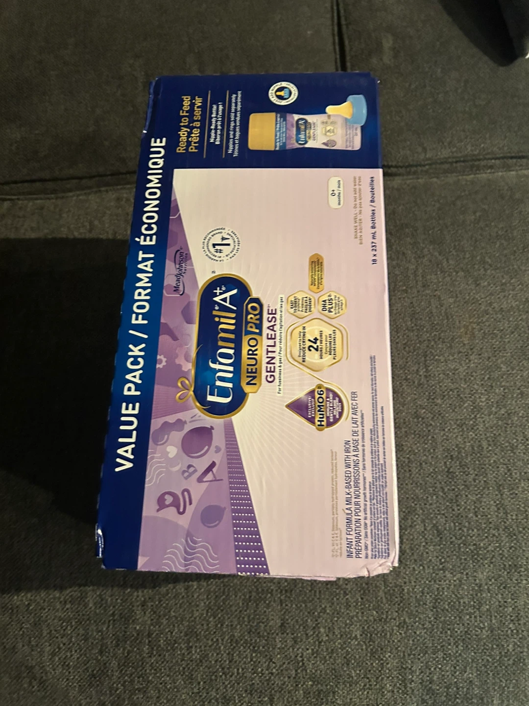 Selling a value pack of Enfamil A+ Neuropro Gentlease infant formula. This formula is milk-based with iron, and is ready to feed. Suitable for babies 0+ months. Each bottle contains 237 mL. There are 18 bottles in the pack
