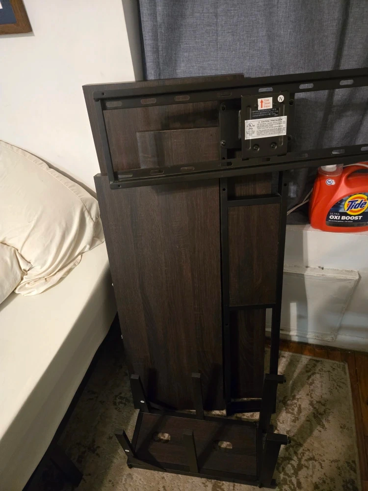 Tv stand has three shelves that provide ample storage for electronics. The tv mounts to the stand and can swivel. It is currently dissembled and is easy enough to move. 5 pieces in total
