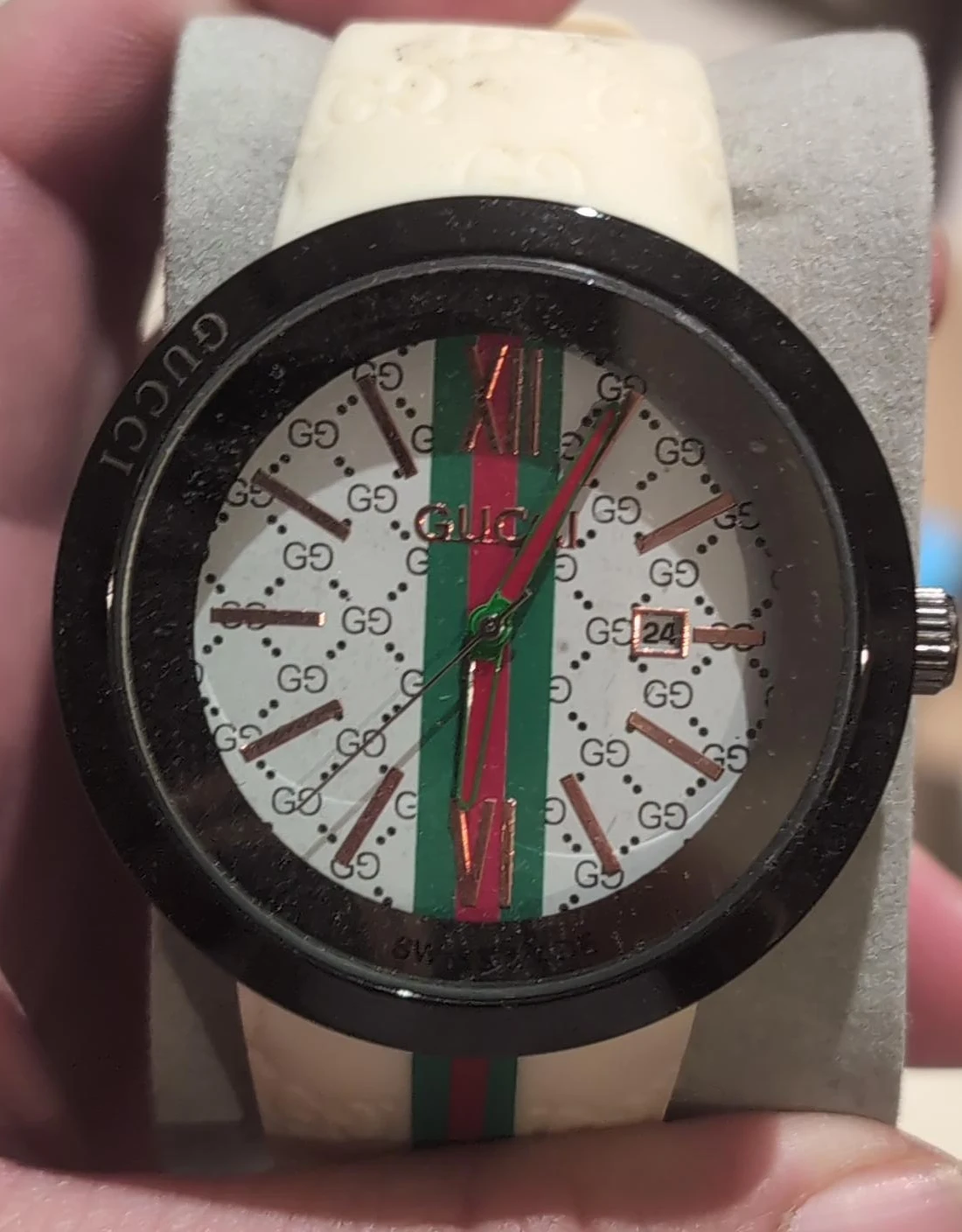 Selling a Gucci watch with a white band. It features the classic Gucci design on the face with green and red stripes. The watch has a black bezel and shows the date.