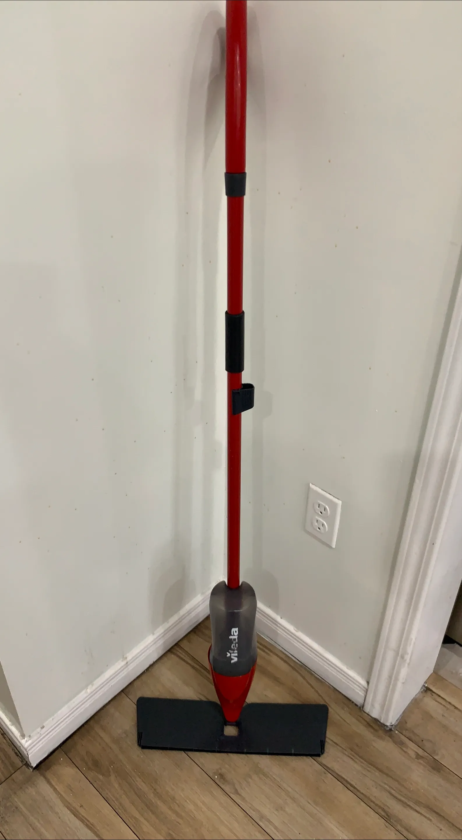 Keep your floors sparkling with this Vileda spray mop! It's in great condition and ready to help you tackle those messes. The red handle and convenient spray mechanism make cleaning a breeze. Perfect for quick cleanups!