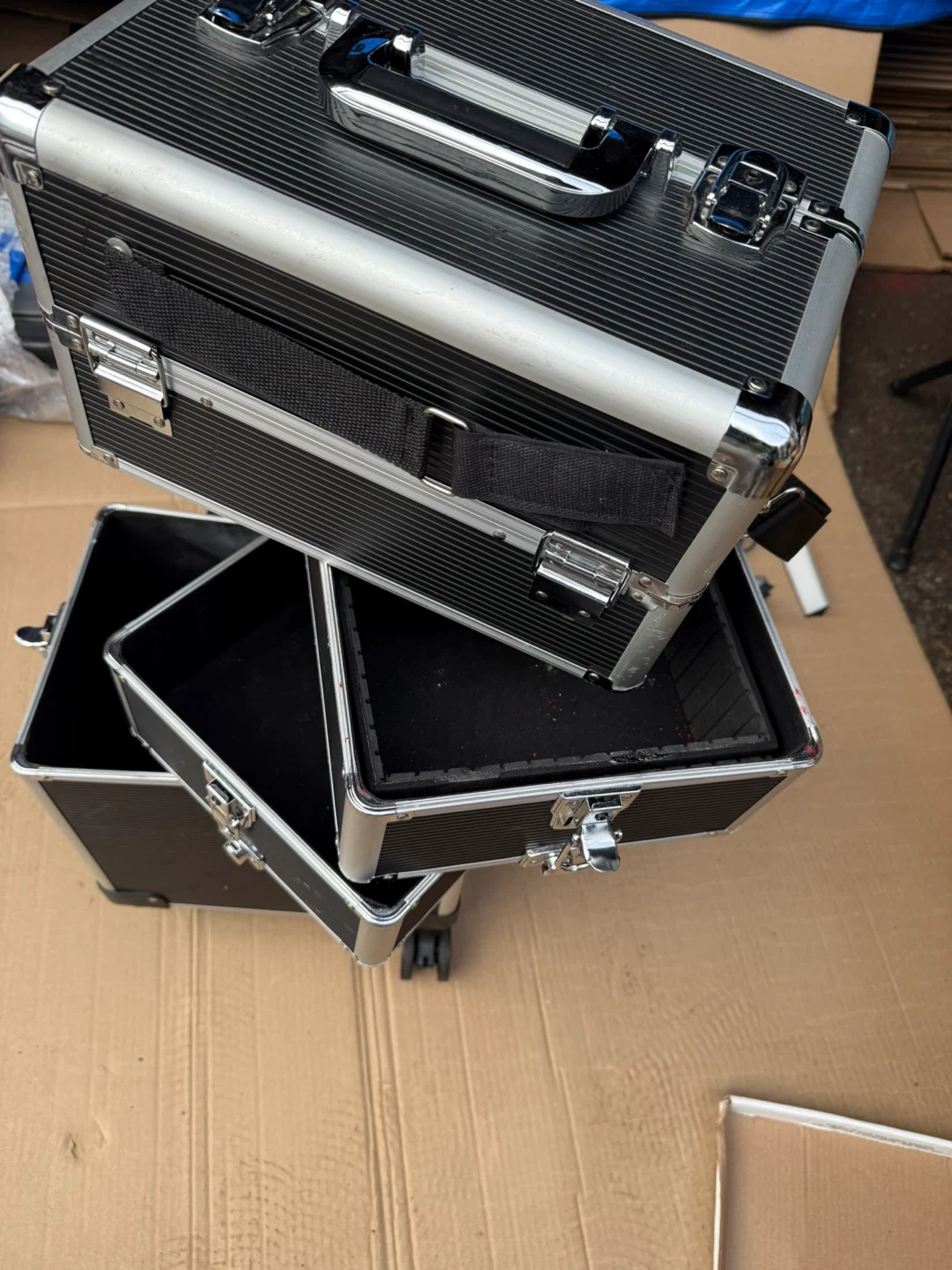 Selling a rolling makeup/cosmetic organizer case. It's black with silver trim and has multiple compartments for storing all your beauty essentials. Perfect for makeup artists or anyone who needs to keep their cosmetics organized and portable!