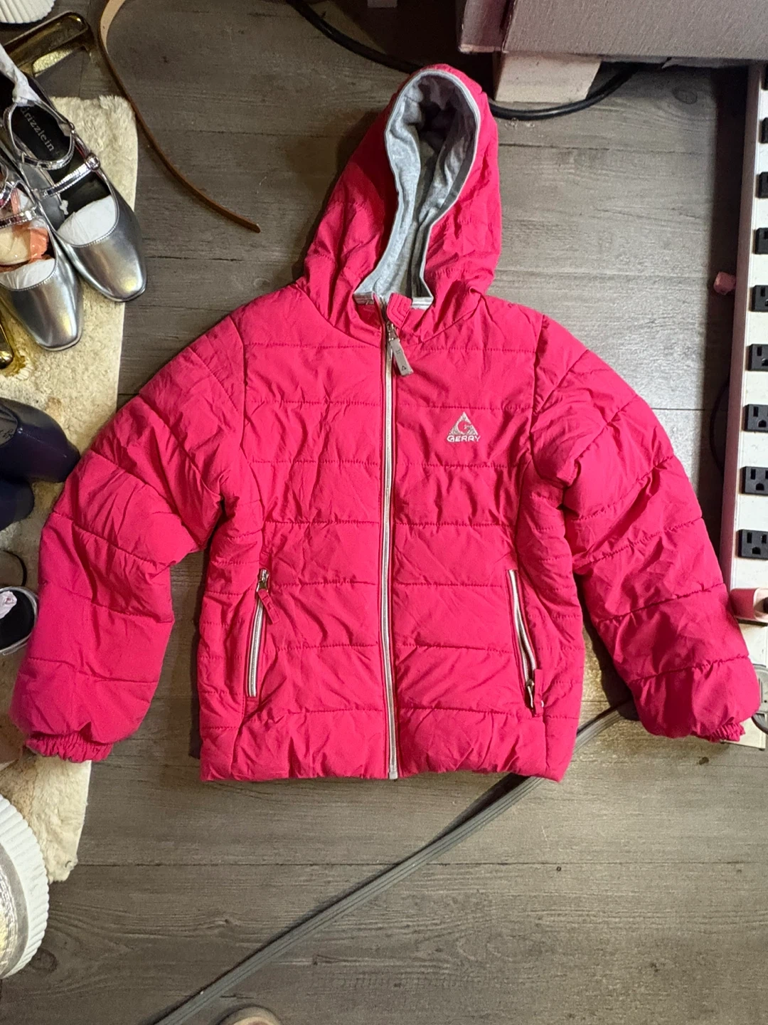 Here's a cute Gerry puffer jacket in a vibrant pink color! It features a hood with a gray lining and a front zipper. Perfect for keeping your little one warm and stylish!