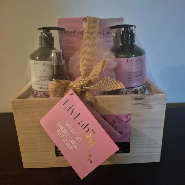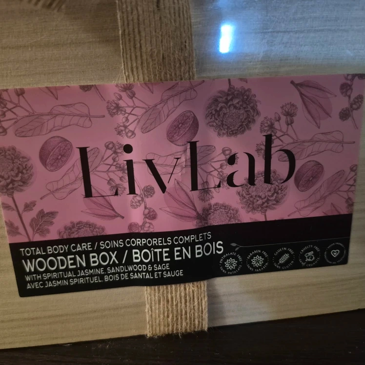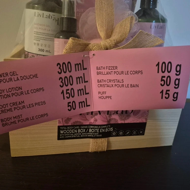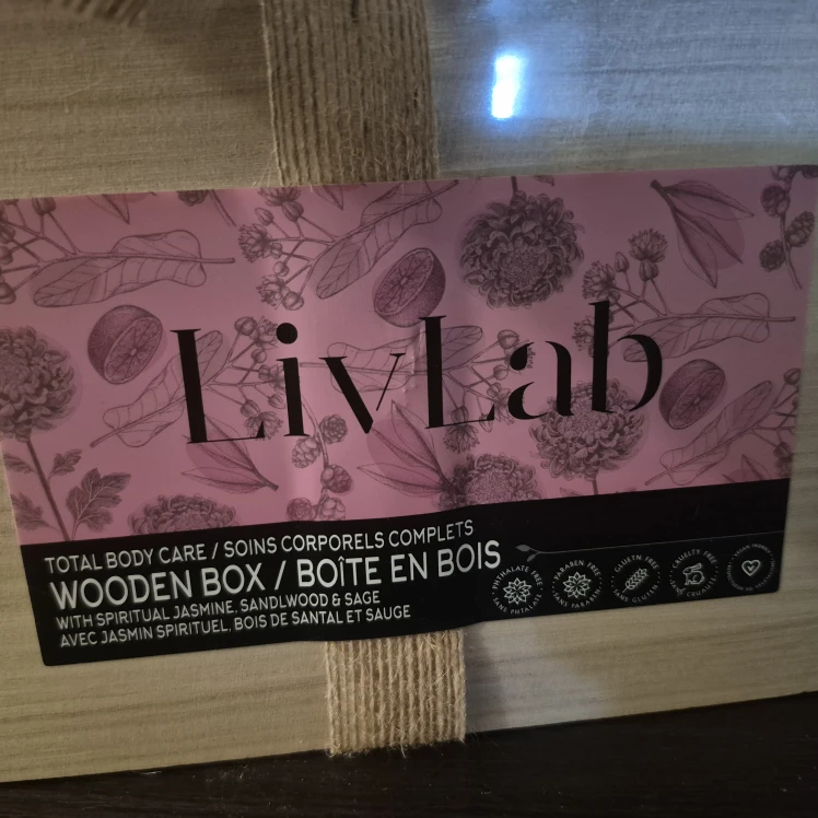 Selling a LivLab bath gift set! It comes in a lovely wooden box and includes shower gel (300ml), body lotion (300ml), foot cream (150ml), and body mist (50ml). Also included are bath fizzer (100g), bath crystals (50g), and a puff (15g)! Perfect for a spa day at home