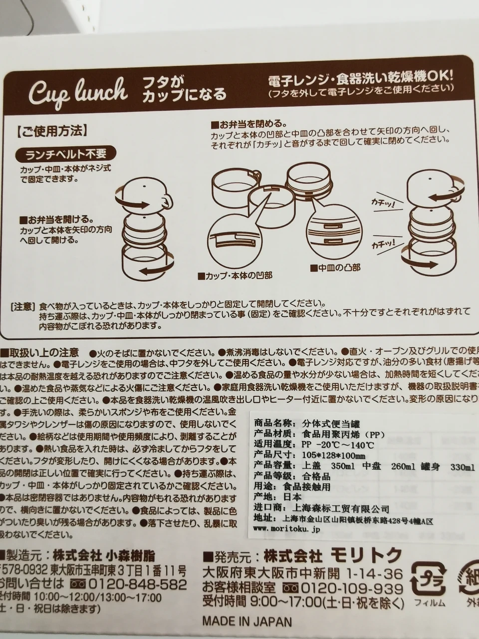 This Moritoku Cup Lunch is perfect for anyone looking to enjoy a warm meal on the go, and it is brand new in its original packaging. This innovative lunchbox features a unique design where the lid doubles as a cup, making it super convenient for soups, stews, or any dish you'd like to sip or spoon.