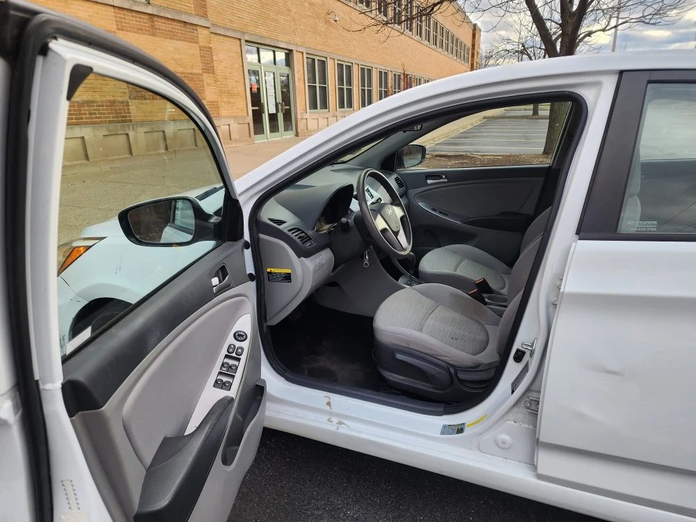 Selling a white Hyundai Accent sedan. It's a reliable and fuel-efficient car for everyday use. It has some wear and tear, but it's in good working condition.