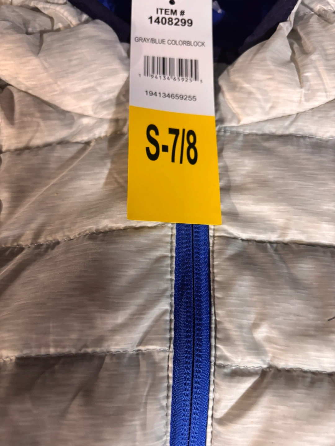 I'm selling a brand new Eddie Bauer Kids Reversible Down Jacket in size 7/8. This stylish jacket features a gray/blue colorblock design and is perfect for keeping your little one warm and cozy. It's easy care, reversible and storm repelent. Grab it now!