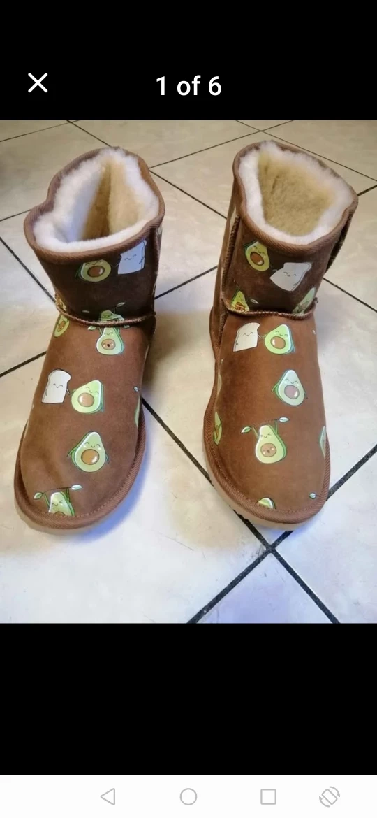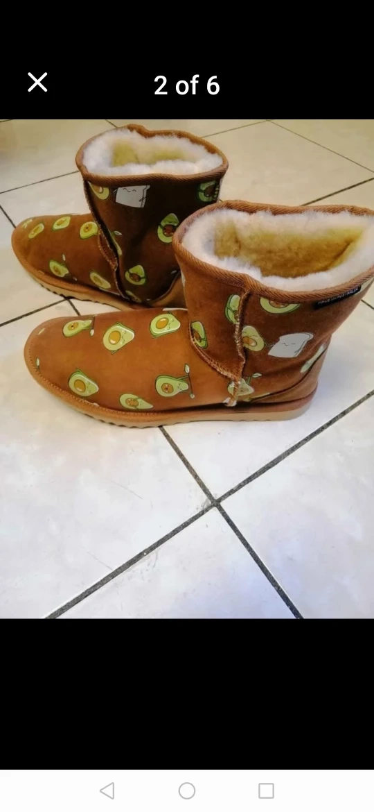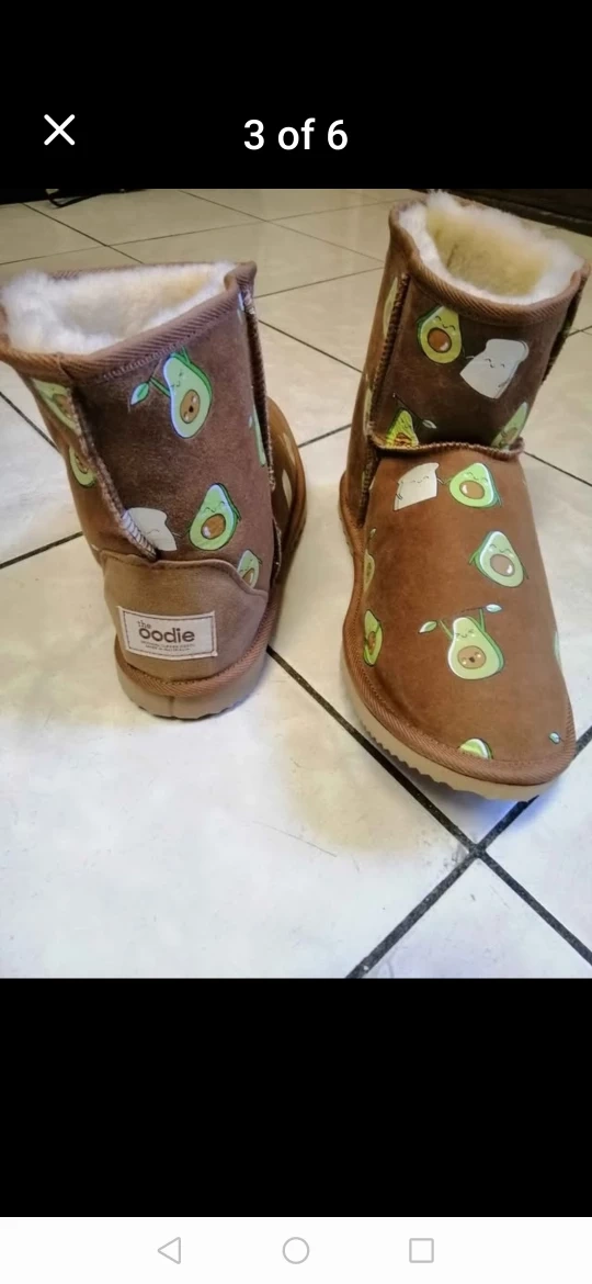 Super cute and comfy slipper boots from The Oodie! These are in a women's size 13 (USA) men 12 and feature an adorable avocado toast print. Perfect for keeping your feet warm and cozy this winter!