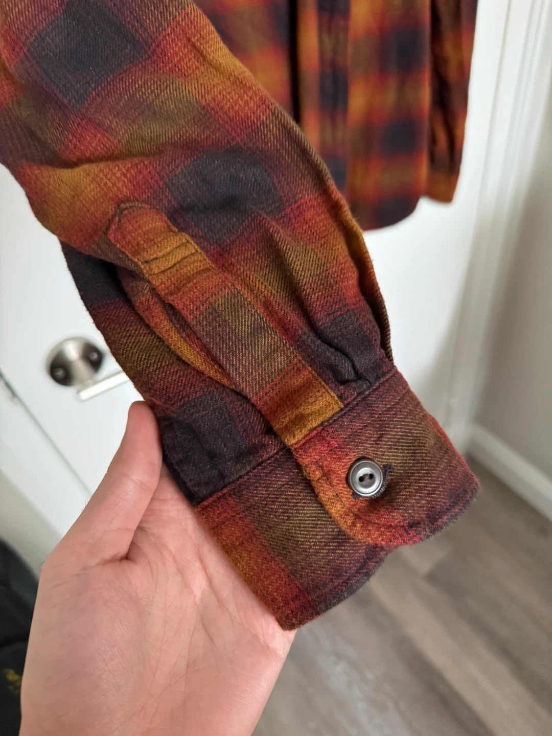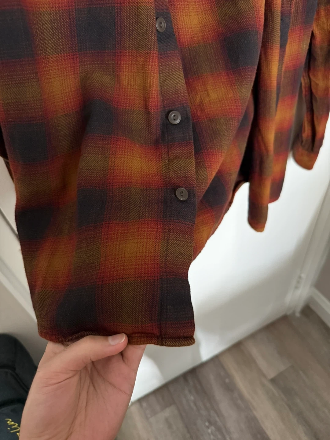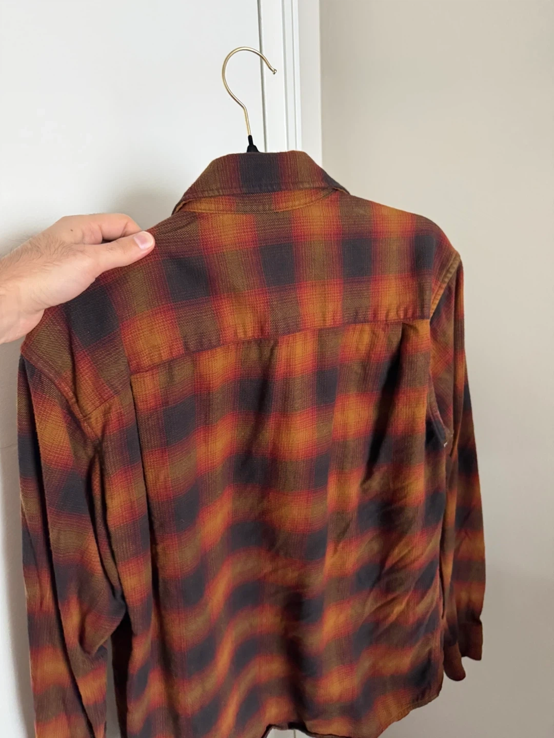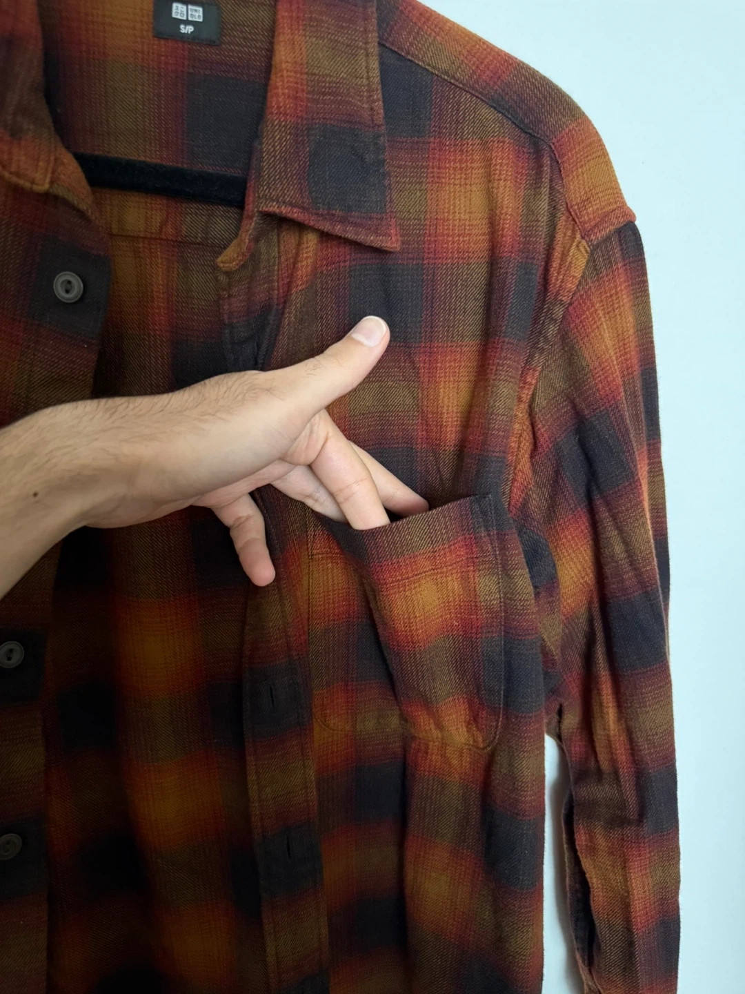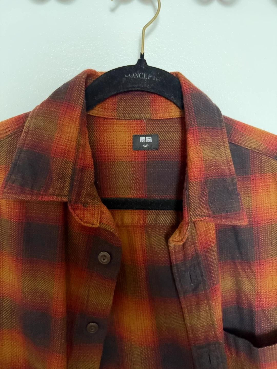 Uniqlo flannel shirt Size S It features a warm, earthy plaid pattern in shades of brown, orange, and black. Perfect for layering during those cooler days! In great condition