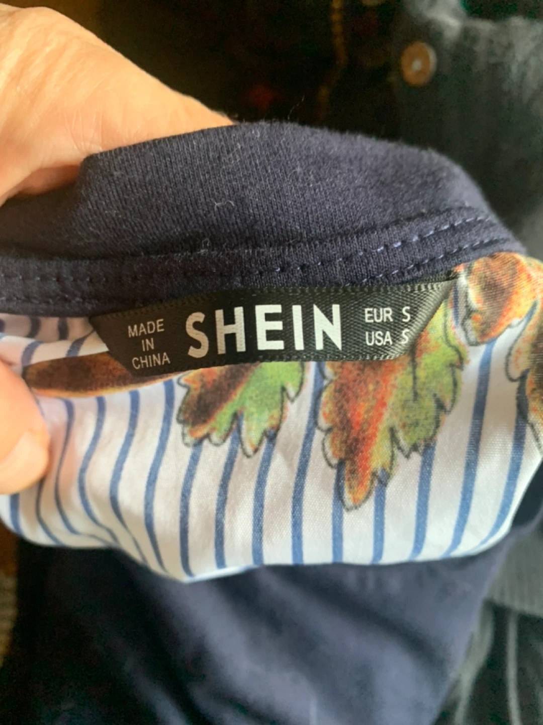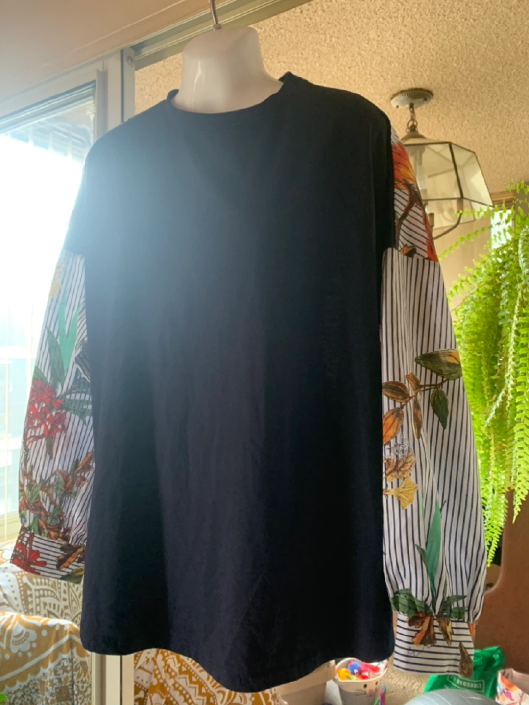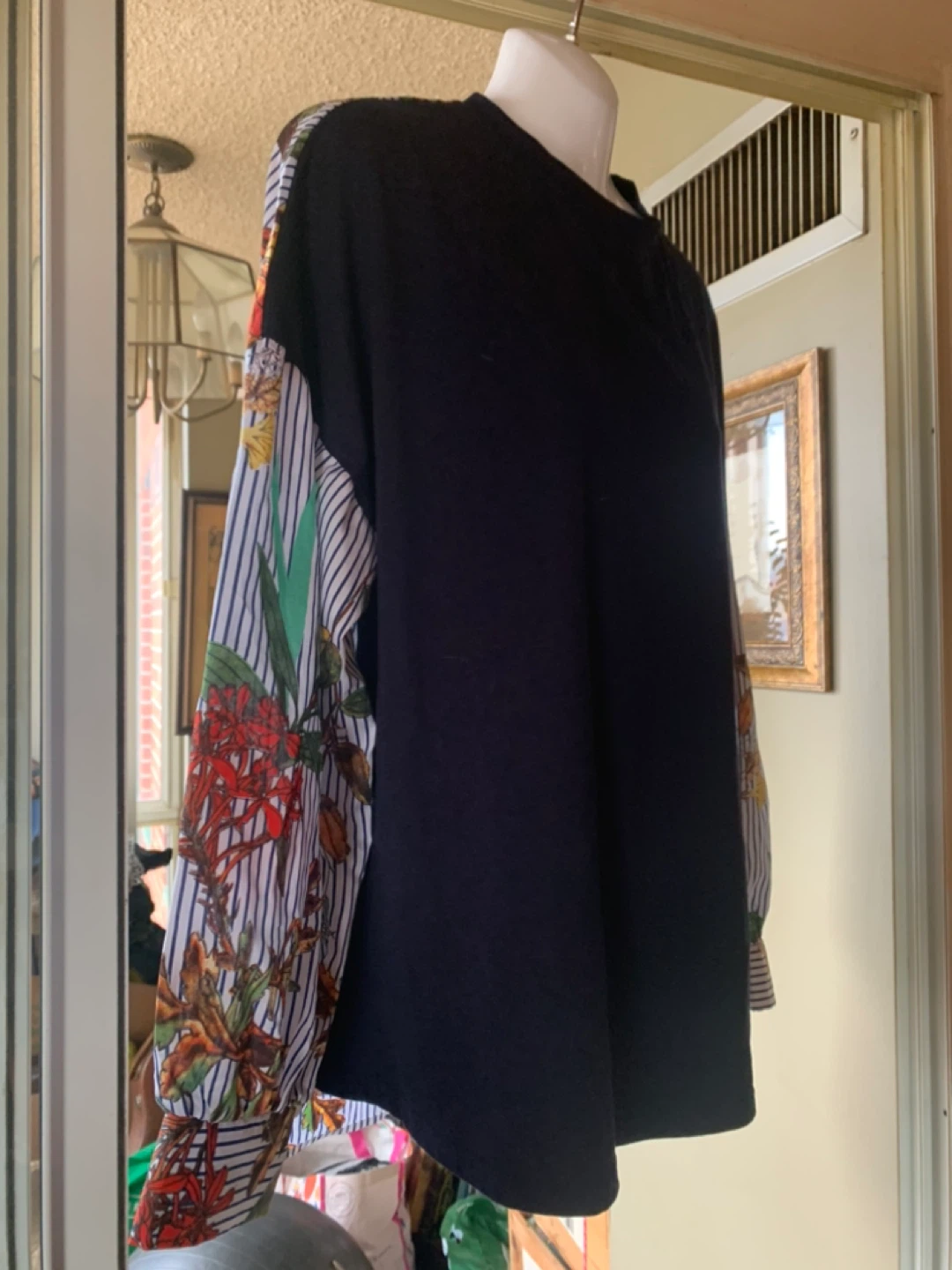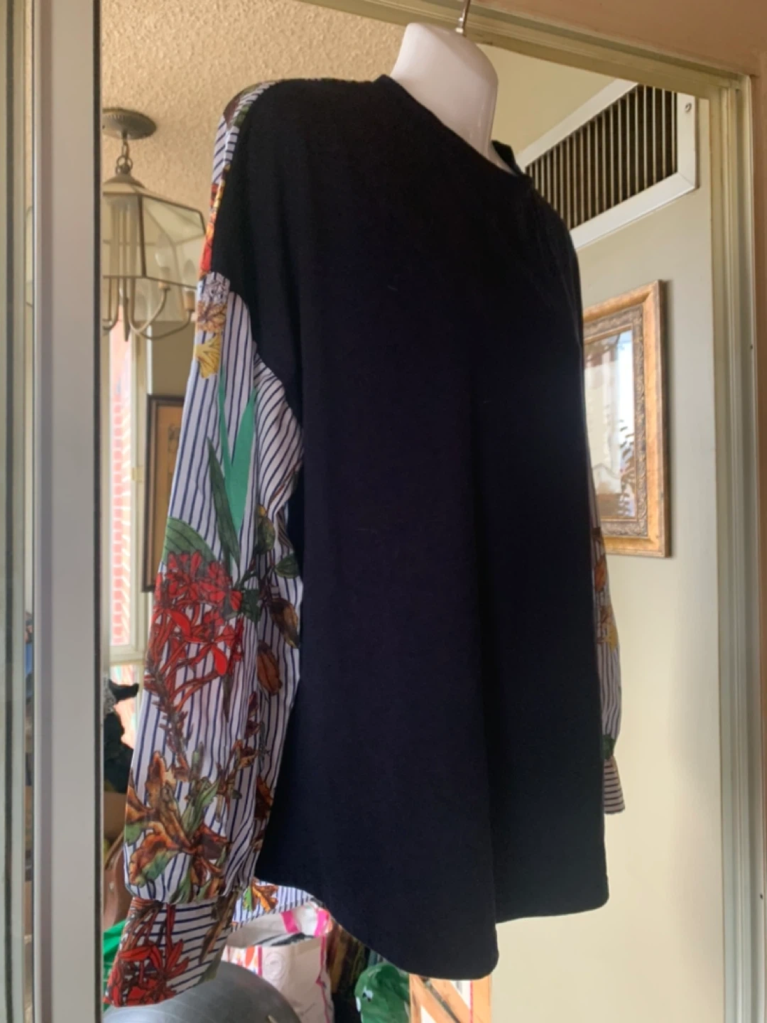 Here's a cute Shein top in size small! It's a solid black colour with floral and striped patterned sleeves. Perfect for adding a pop of colour to your wardrobe!