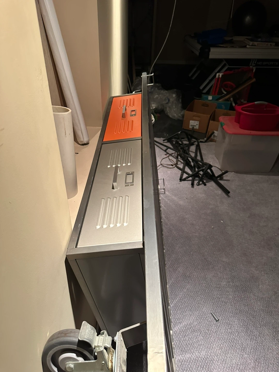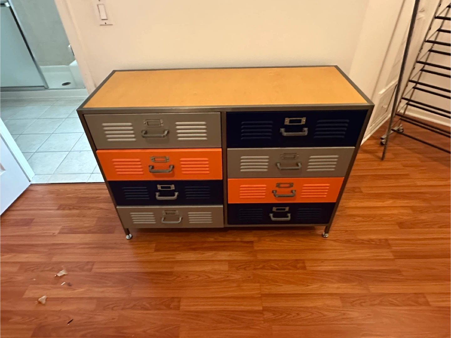 Here's a fun and functional locker-style dresser and twin bed frame with drawers! It features a mix of bears colors like gray, navy, and orange. The top measures approximately 47 inches in length and 25 inches in width. Perfect for adding a pop of color to any room set is heavy duty and perfect for any Bears fans room.