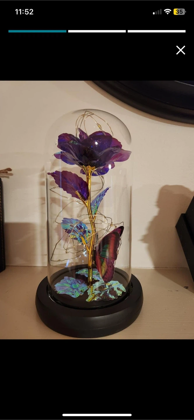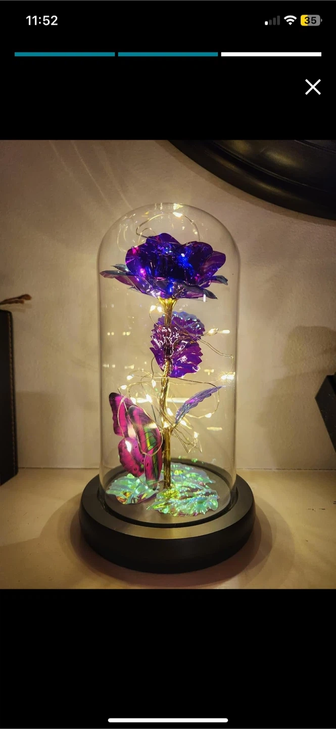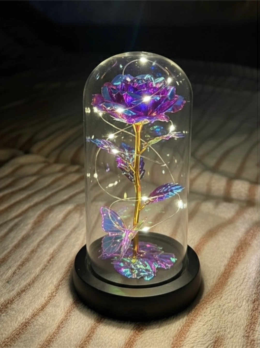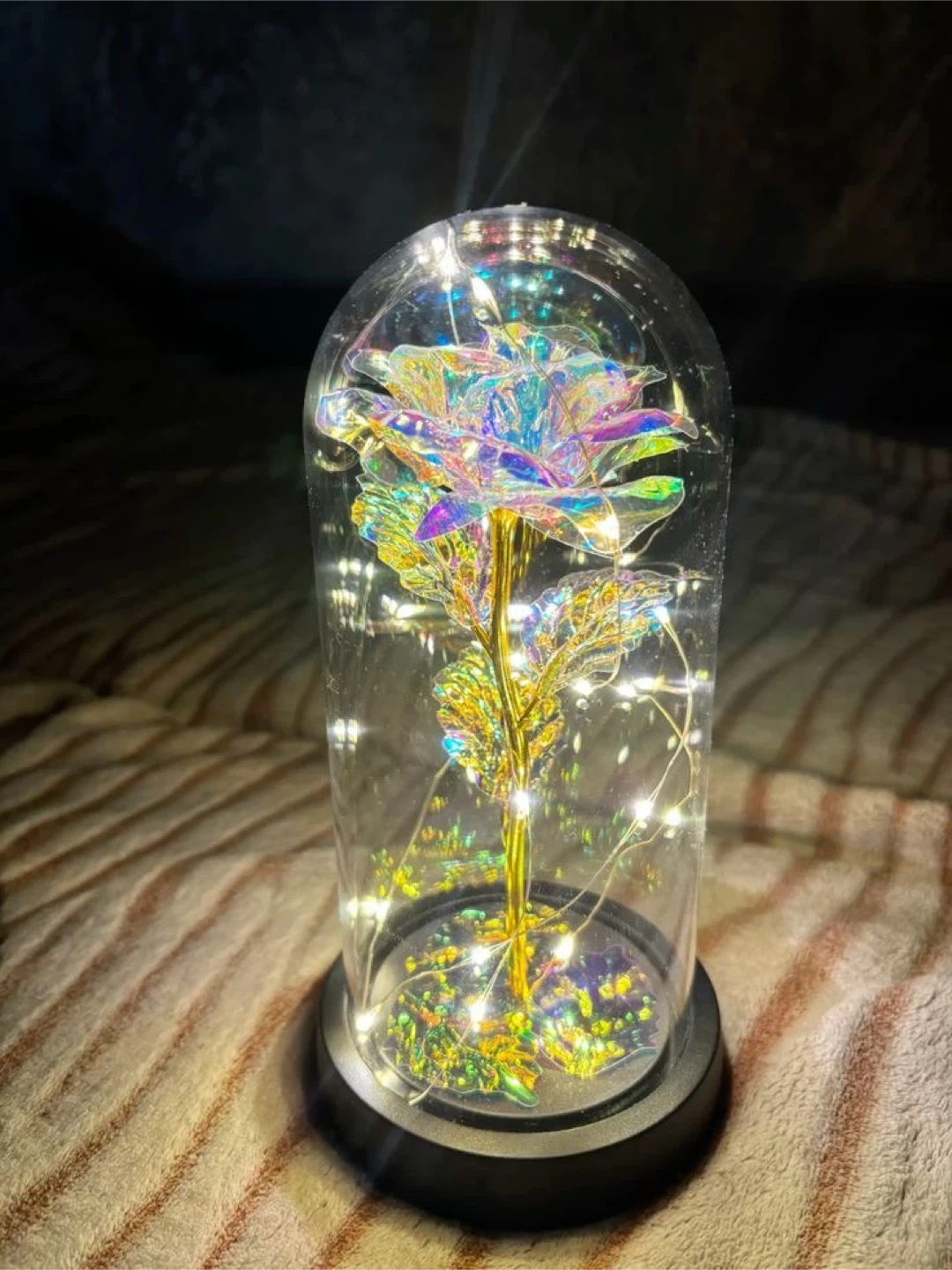 Add a touch of magic to your home with this beautiful enchanted rose lamp! It features a colorful rose encased in a glass dome with fairy lights. Perfect for a nightlight or decorative piece