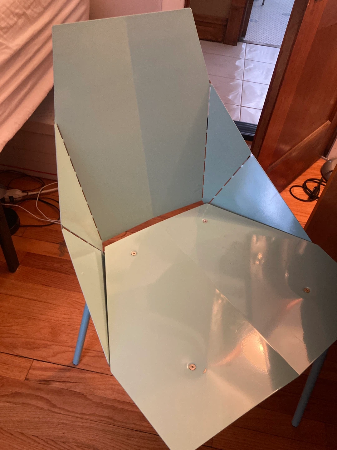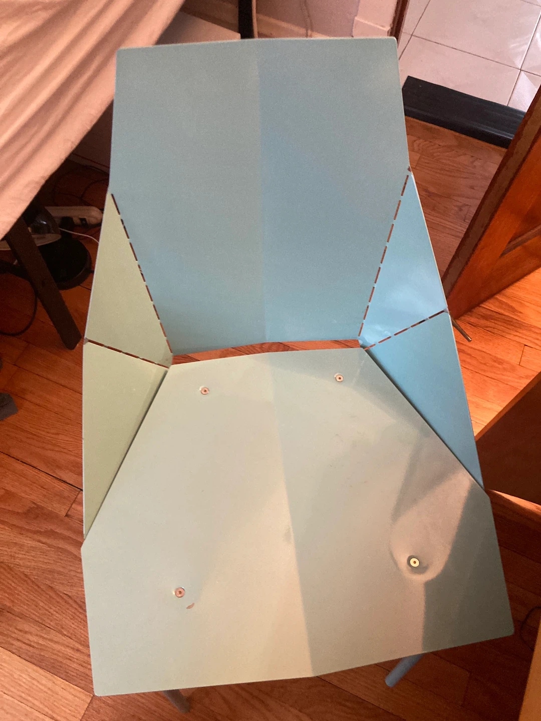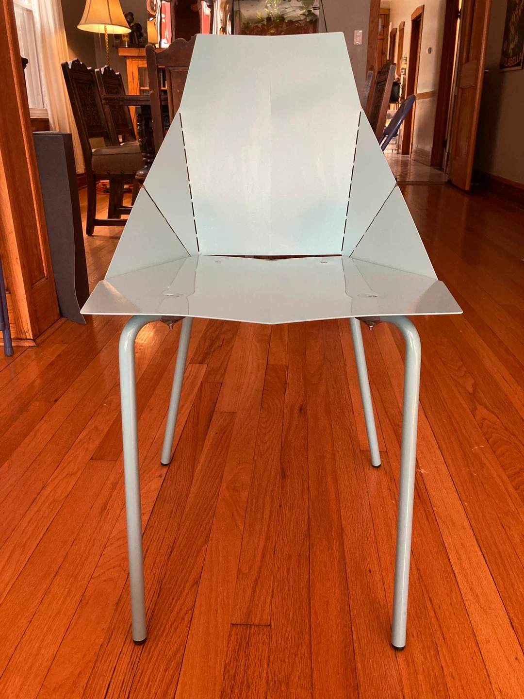 Designer Metal Chair by Blu Dot. Weighs about 18 pounds. Back height: 15" Leg height 18.5" Seat dimensions: 15.5"x18.5" at the widest point. Open to offers.