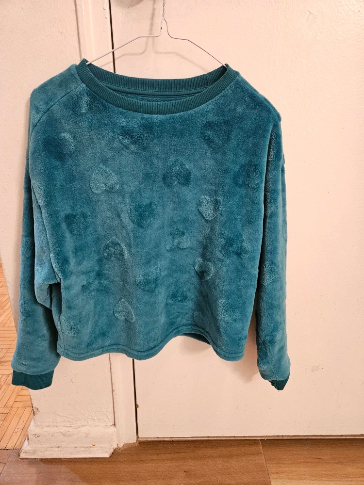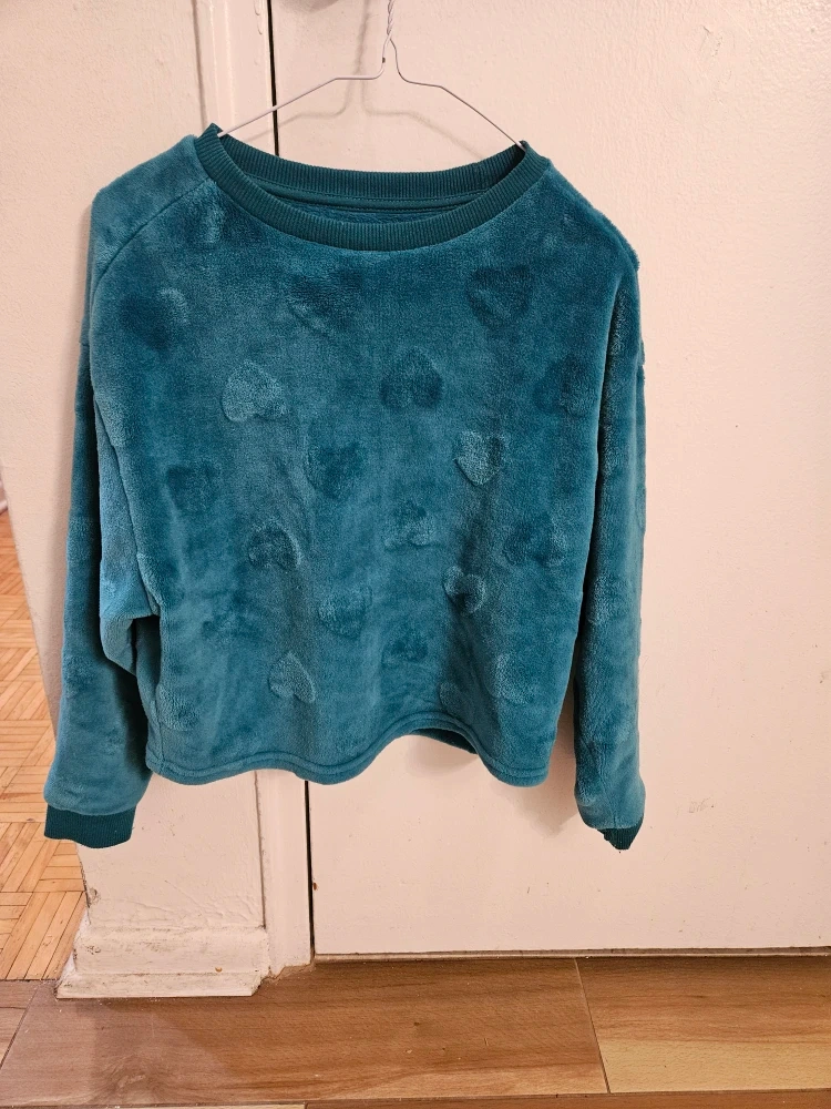 Cozy up in this teal fleece pullover! It features a cute heart pattern throughout and is super soft. Perfect for lounging around the house or adding a touch of warmth to your outfit