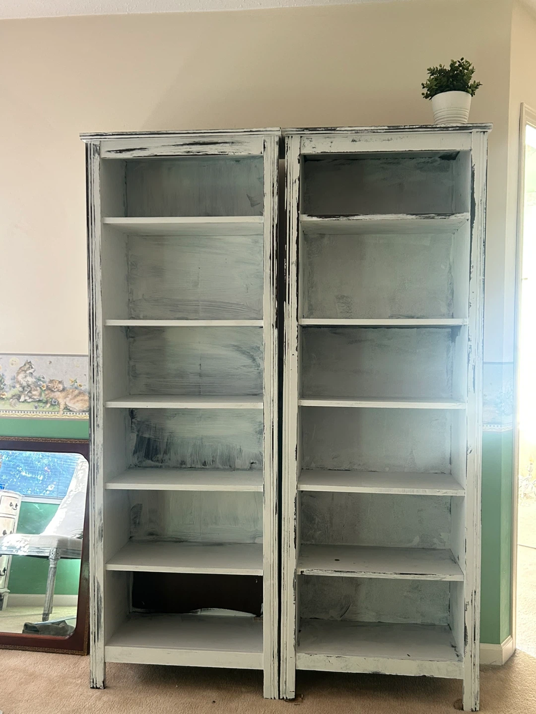 Selling a set of two bookcases. They have a distressed, white-painted finish. Great for adding storage and a rustic touch to any room