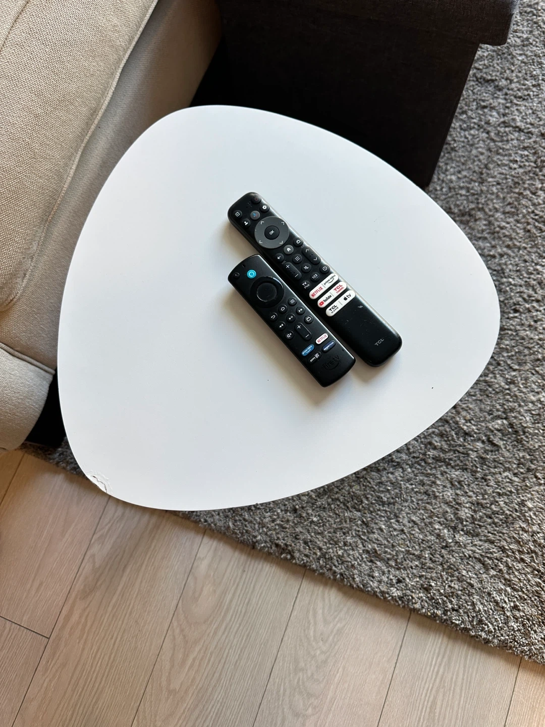 Selling a side table with a triangular shape and wooden legs. There is some slight damage on the edge, as shown in the photos, but it's otherwise in good condition!