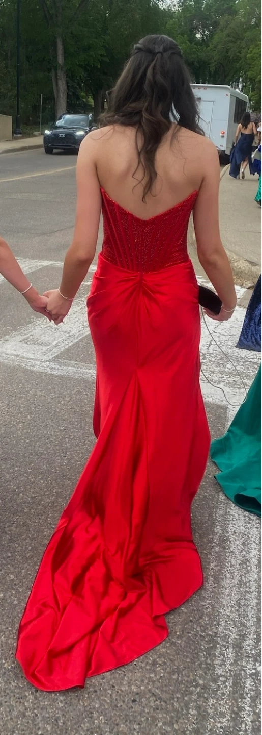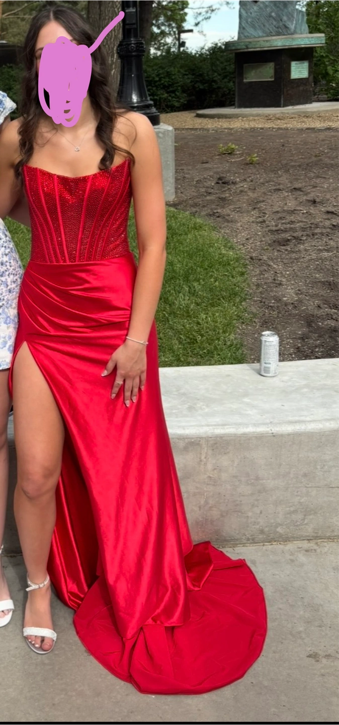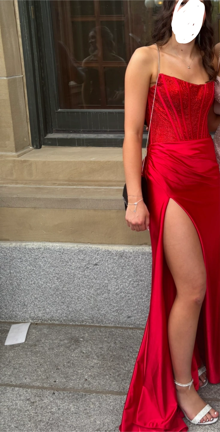 Selling a stunning red corset-style prom dress! It features a beautiful corset top and a stylish slit. Only WORN ONCE. NO ALTERATIONS. Size 4 Sheri Hill #56436