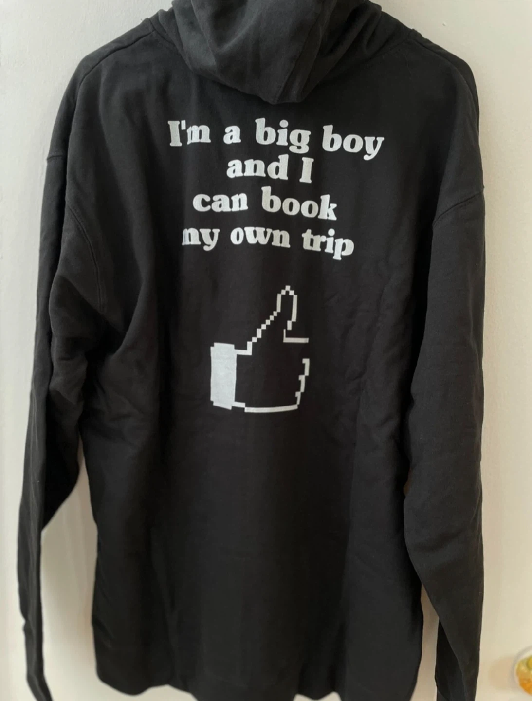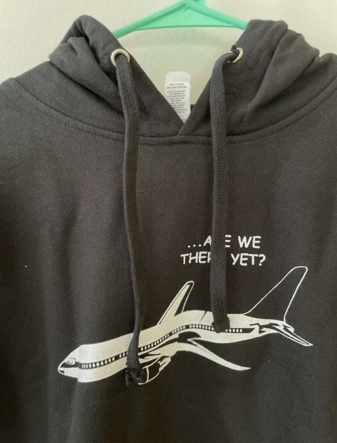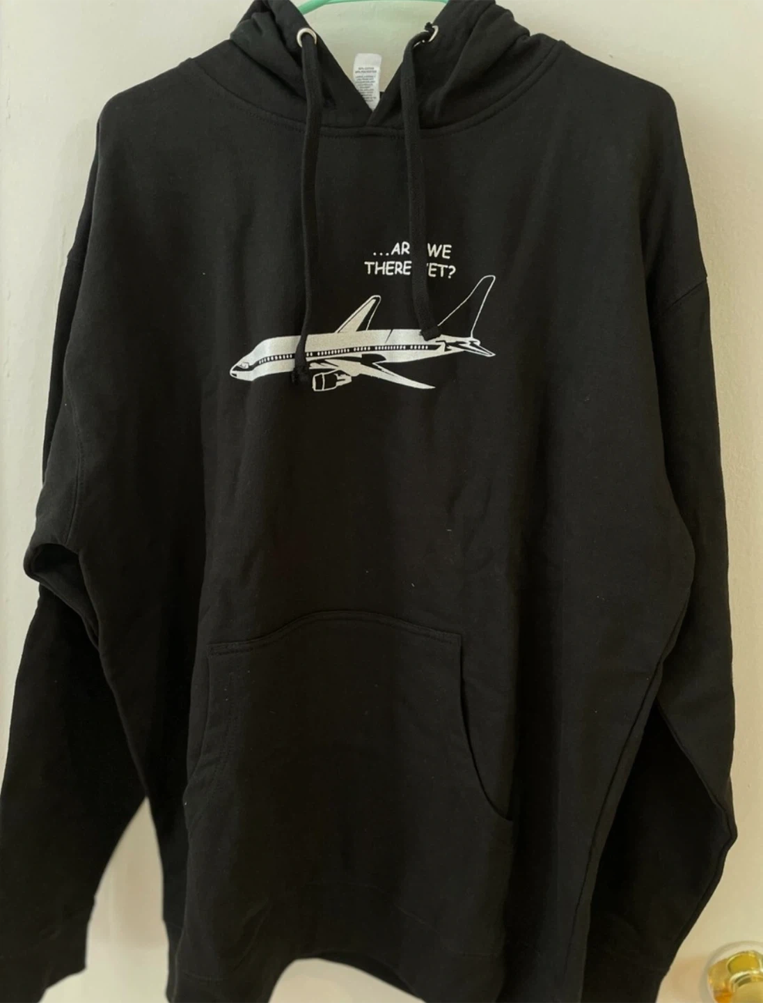 Selling a black hoodie featuring an airplane design. It has the phrase '...Are we there yet?' on the front and 'I'm a big boy and I can book my own trip' on the back. It's a comfortable and stylish piece for anyone who loves to travel or just wants a unique hoodie!