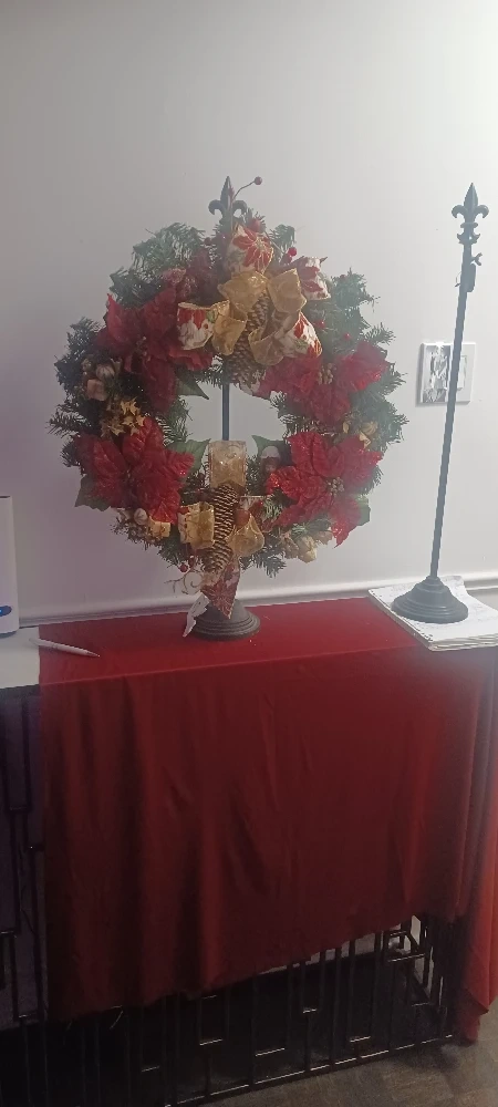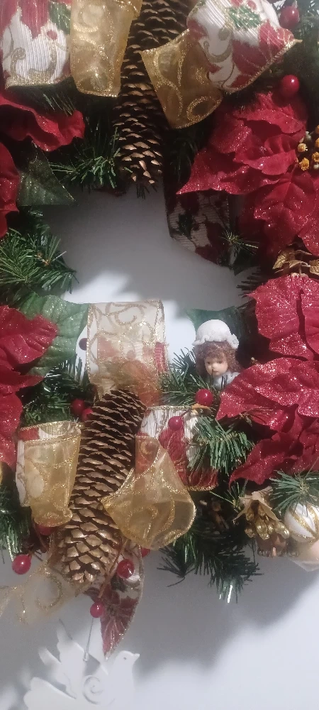 Festive Christmas wreath featuring red poinsettias, gold ribbons, and pine cones! It's perfect for adding a touch of holiday cheer to your home.