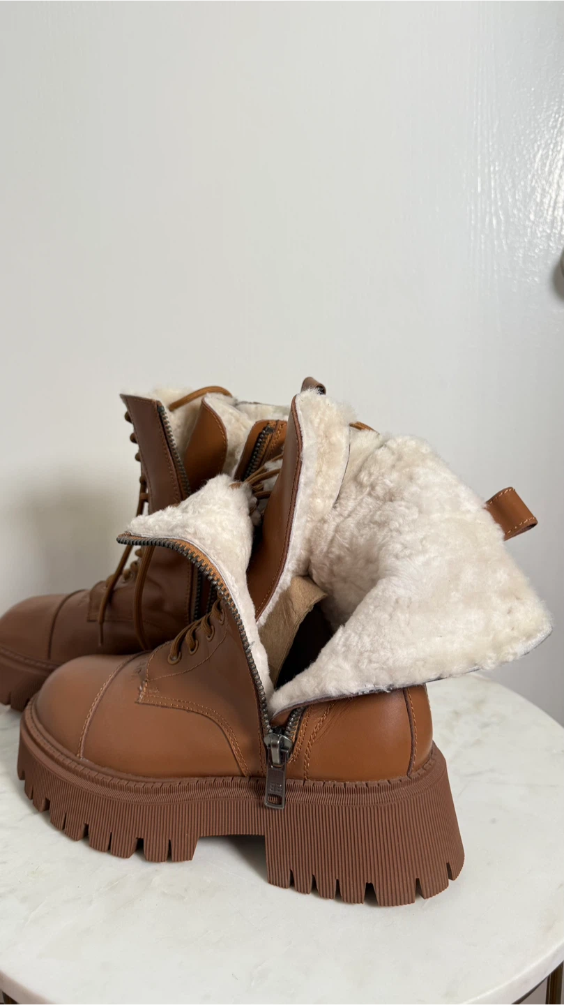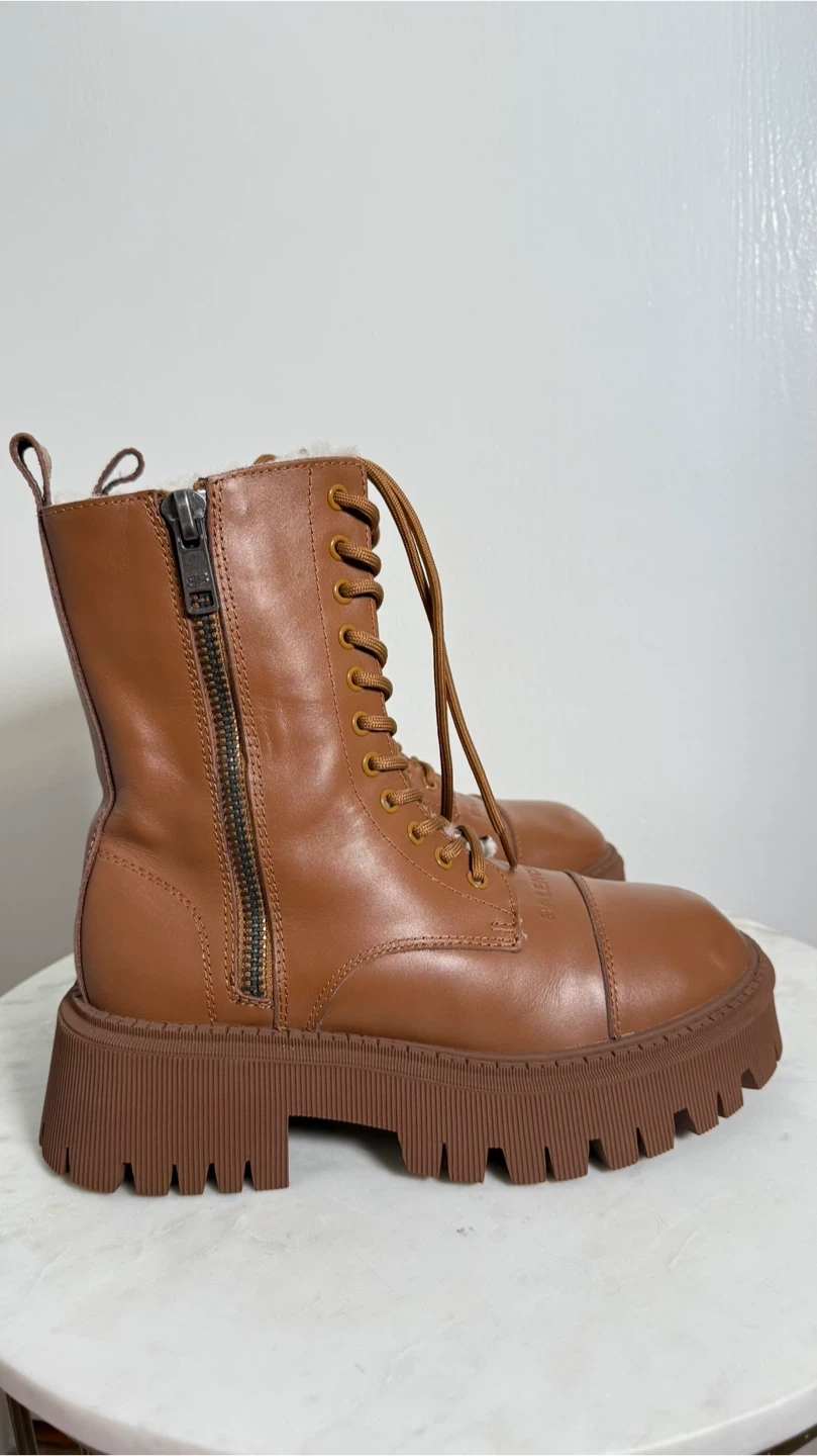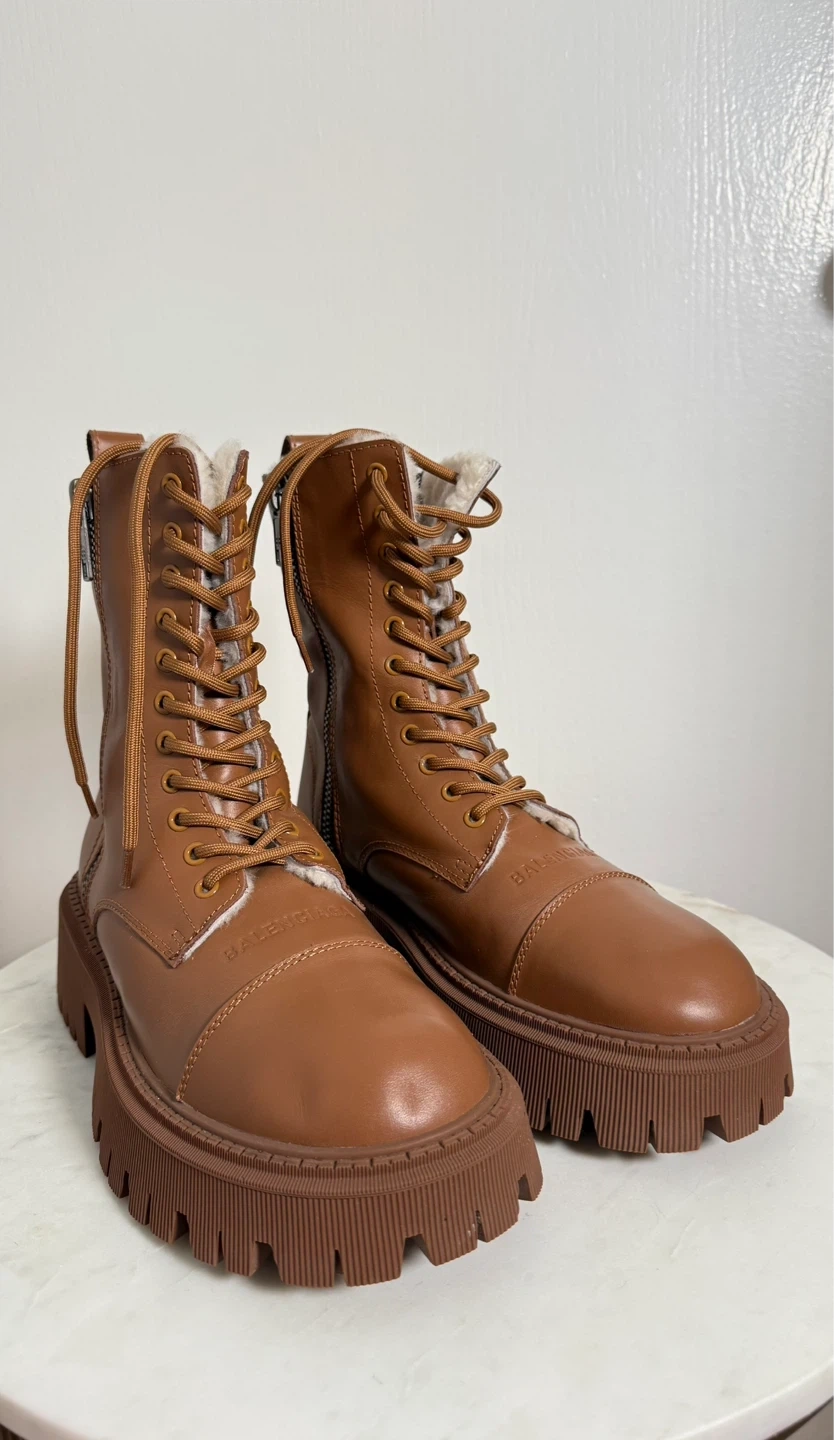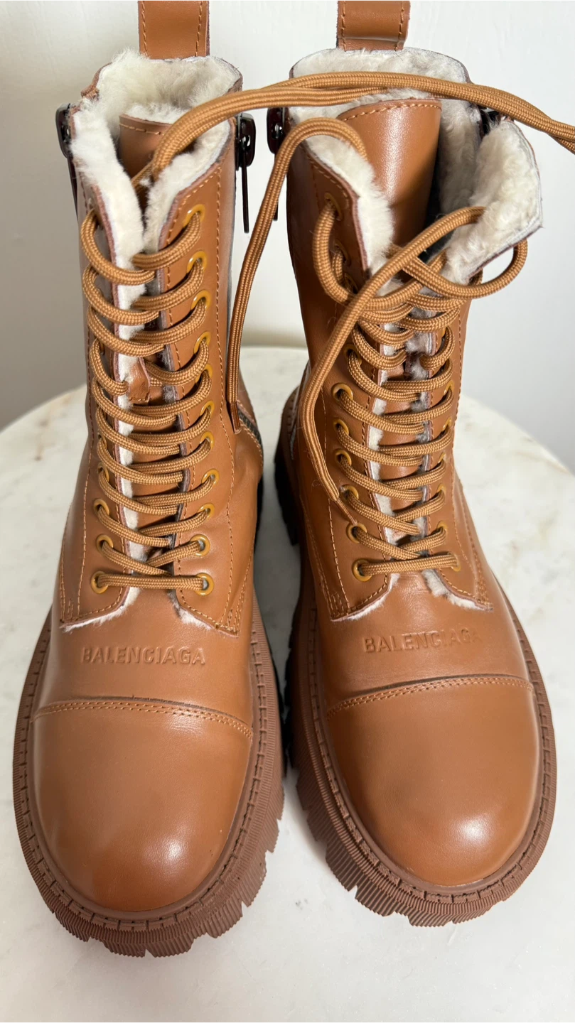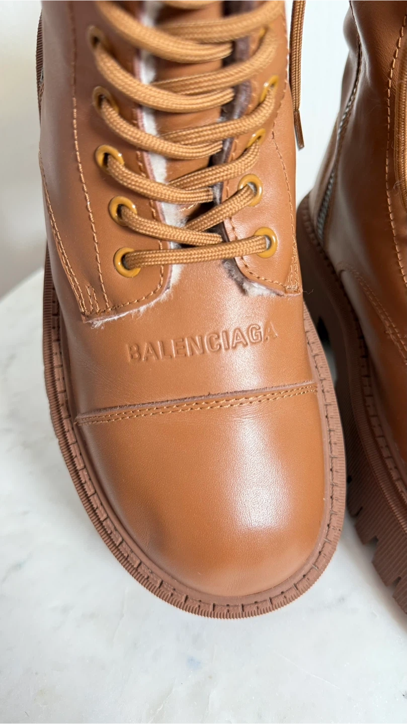 These Balenciaga boots are a stylish and practical addition to any wardrobe. Crafted from brown leather with a bold lug sole design, The boots are in great condition, very warm, and ready for their new home!
