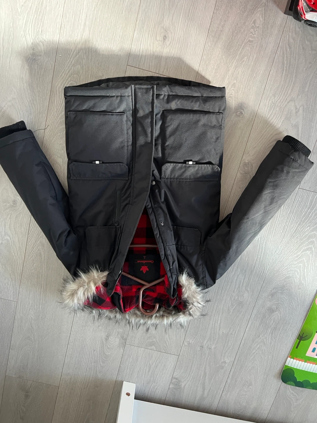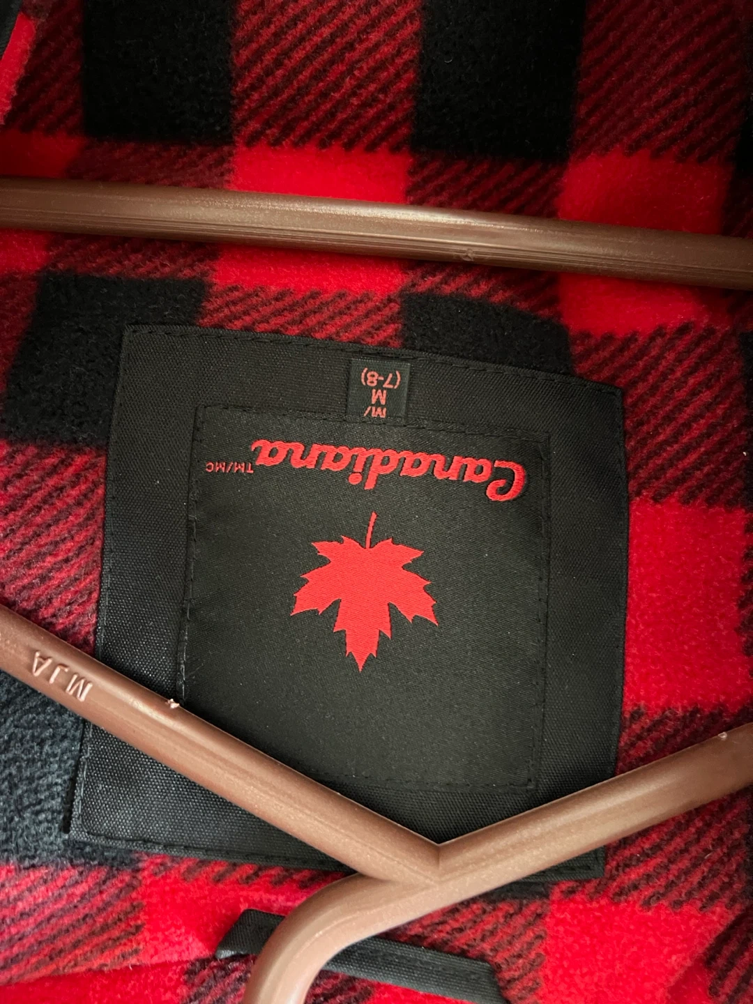 Selling a Canadiana winter parka in black. It's a size M (7-8) and has a red and black plaid lining. The hood has a faux fur trim and there's a white maple leaf on the back