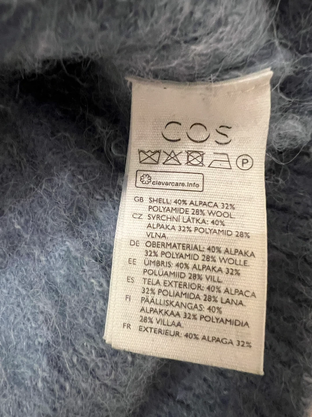 Selling a cozy COS sweater in a lovely blue color. It's a size L and made from a blend of alpaca, polyamide, and wool, making it super soft and warm! The shell is 40% alpaca, 32% polyamide, and 28% wool.