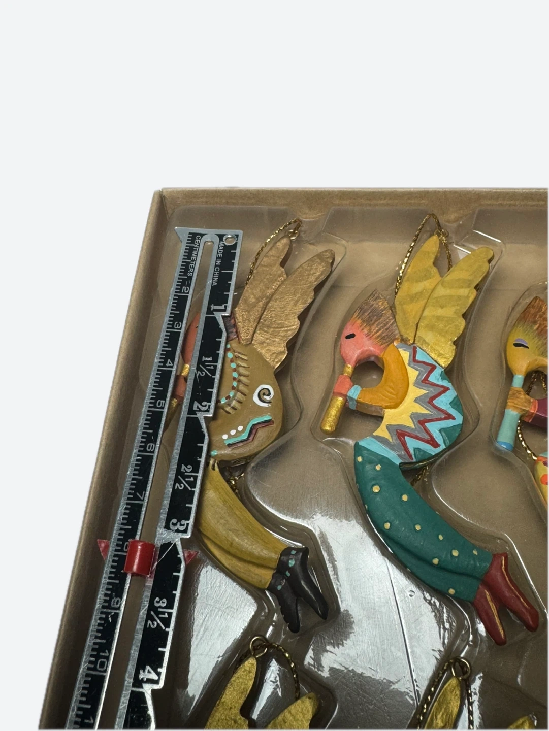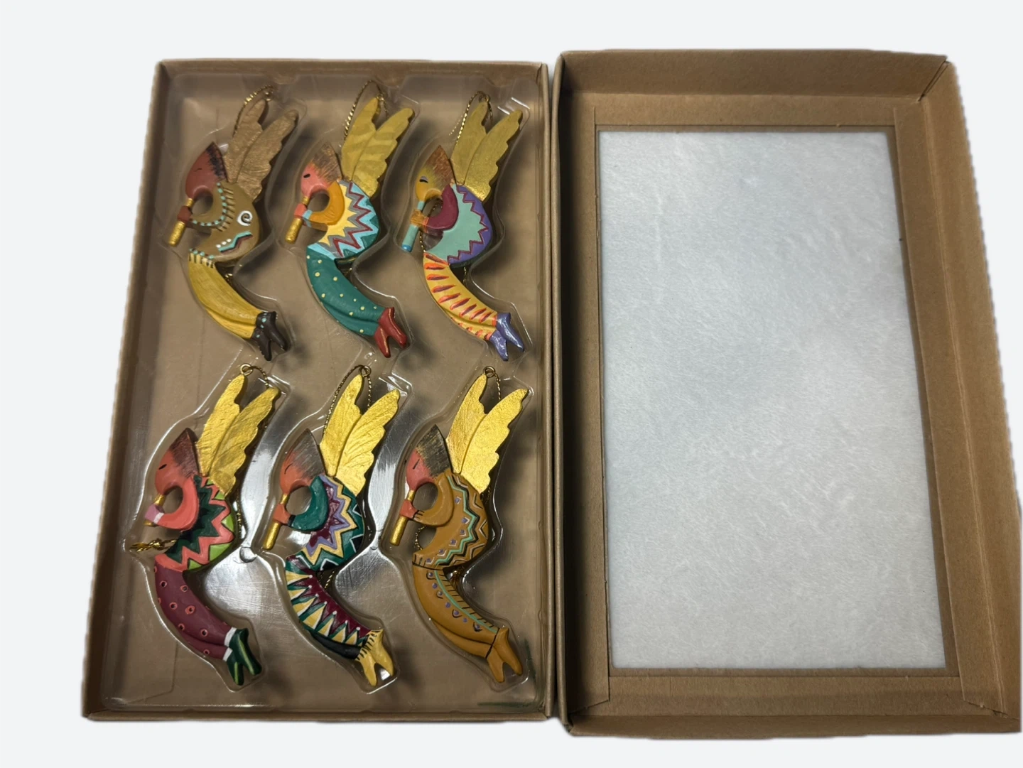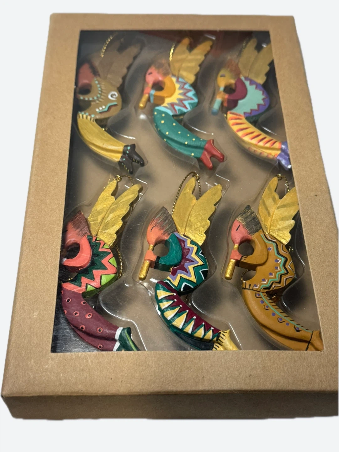 Selling a set of 6 Robert Shields Angel Pelli Kokopelli Ornament 6" unique Wood Decor Gold Wings & Flute angel ornaments, complete with the original box!