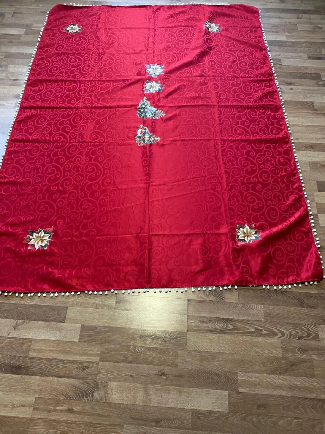 Two tablecloths available! One is a festive red and the other is a rich green. Both have a lovely swirling pattern and sweet pom-pom trim. Perfect for adding a touch of holiday cheer to your dining space!
