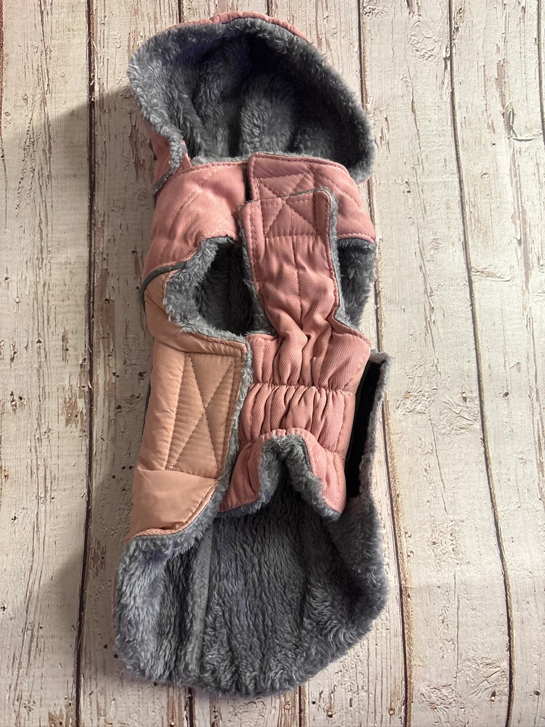 A cute pink dog coat to keep your furry friend warm! It has a hood and a soft, furry lining. Perfect for chilly days