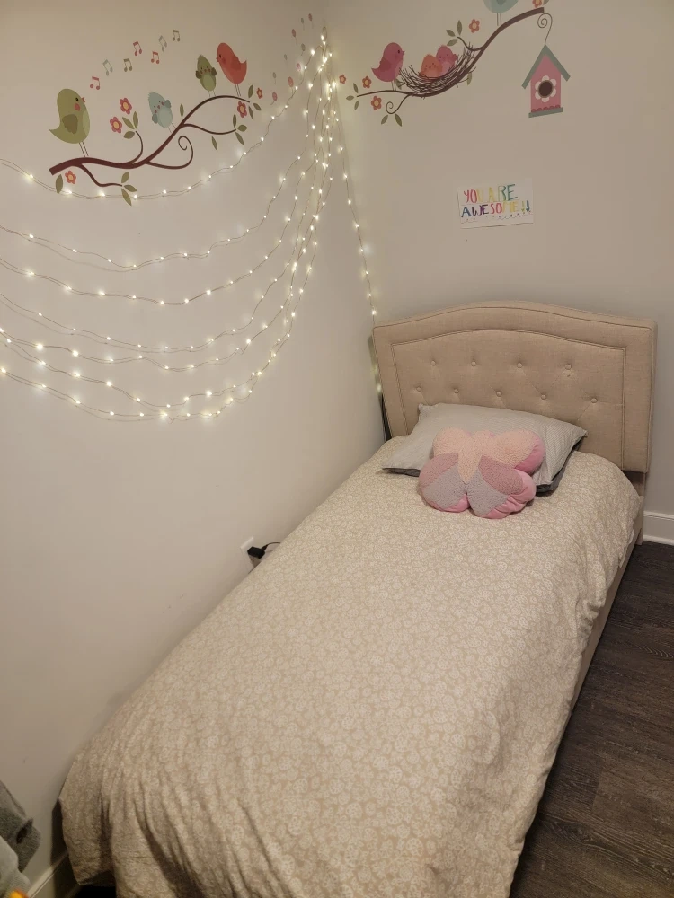 Selling a twin bed frame with an upholstered headboard and mattress. It's in great shape and ready for a new home. Perfect for a kid's room or a guest room!