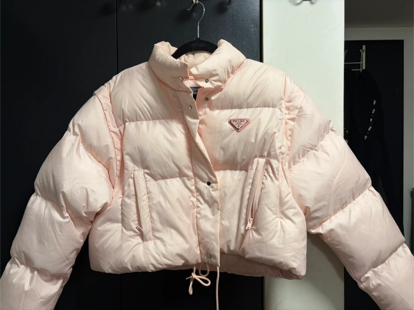 Selling a cute Prada Milano puffer jacket in a lovely pink color! It's in great condition and perfect for staying warm and stylish. The jacket features the iconic Prada logo on the front. Feel free to ask any questions! This jacket turns into a vest when the sleeves are removed!