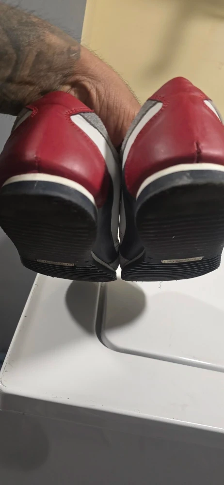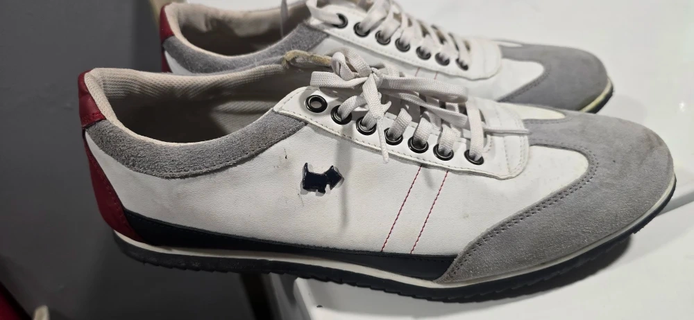 Selling a pair of Radley London sneakers! They feature a white and gray color scheme with red accents on the heel. The shoes have a lace-up closure and the Radley dog logo is visible on the side. They show some signs of wear but are still in good condition!