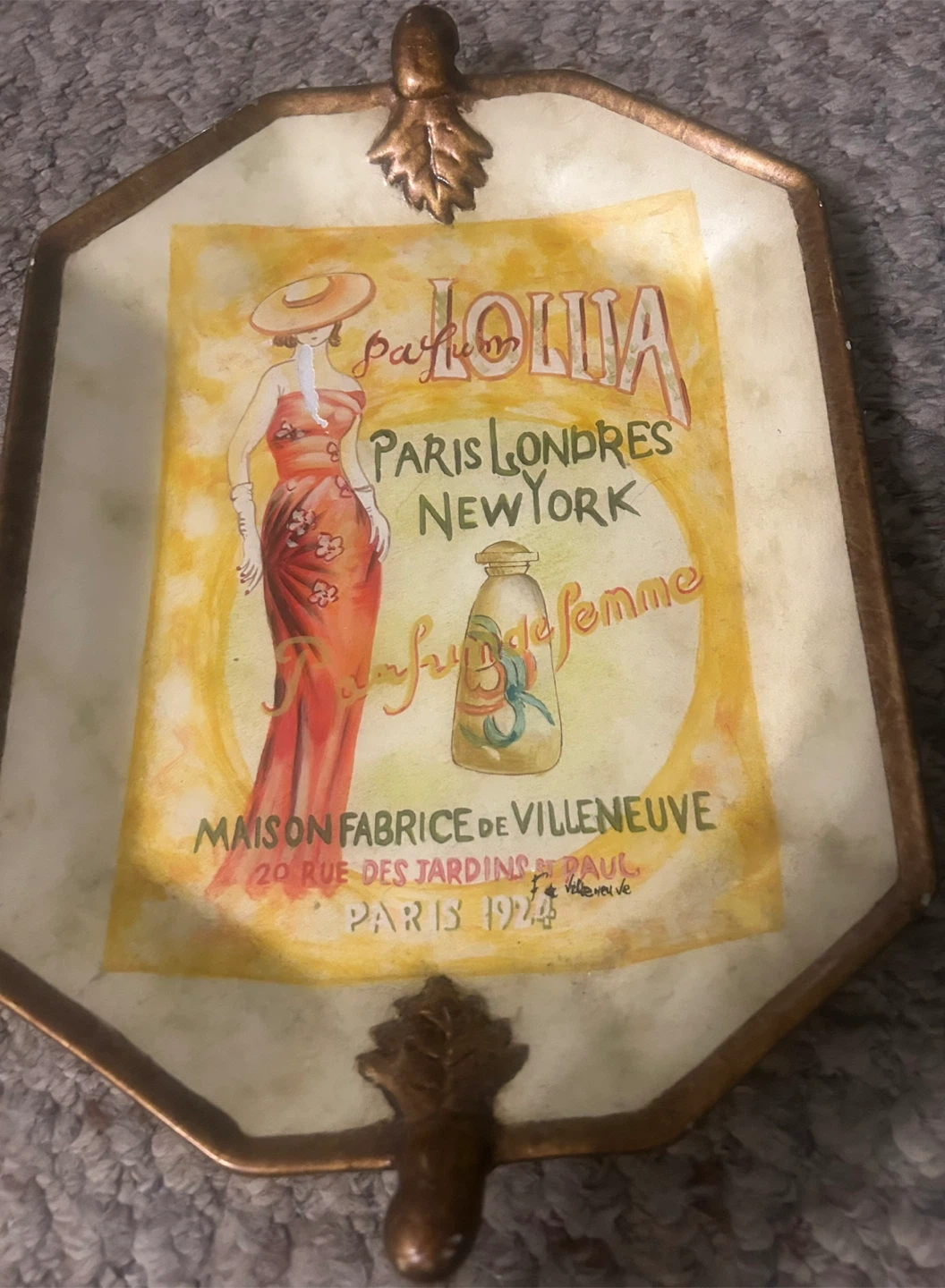 This is a hand-painted decorative tray from TamSan Designs of Cornelius, NC. It features a vintage-style perfume advertisement design. Would look great on a dresser or vanity!