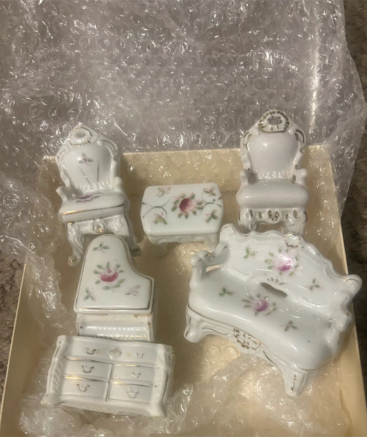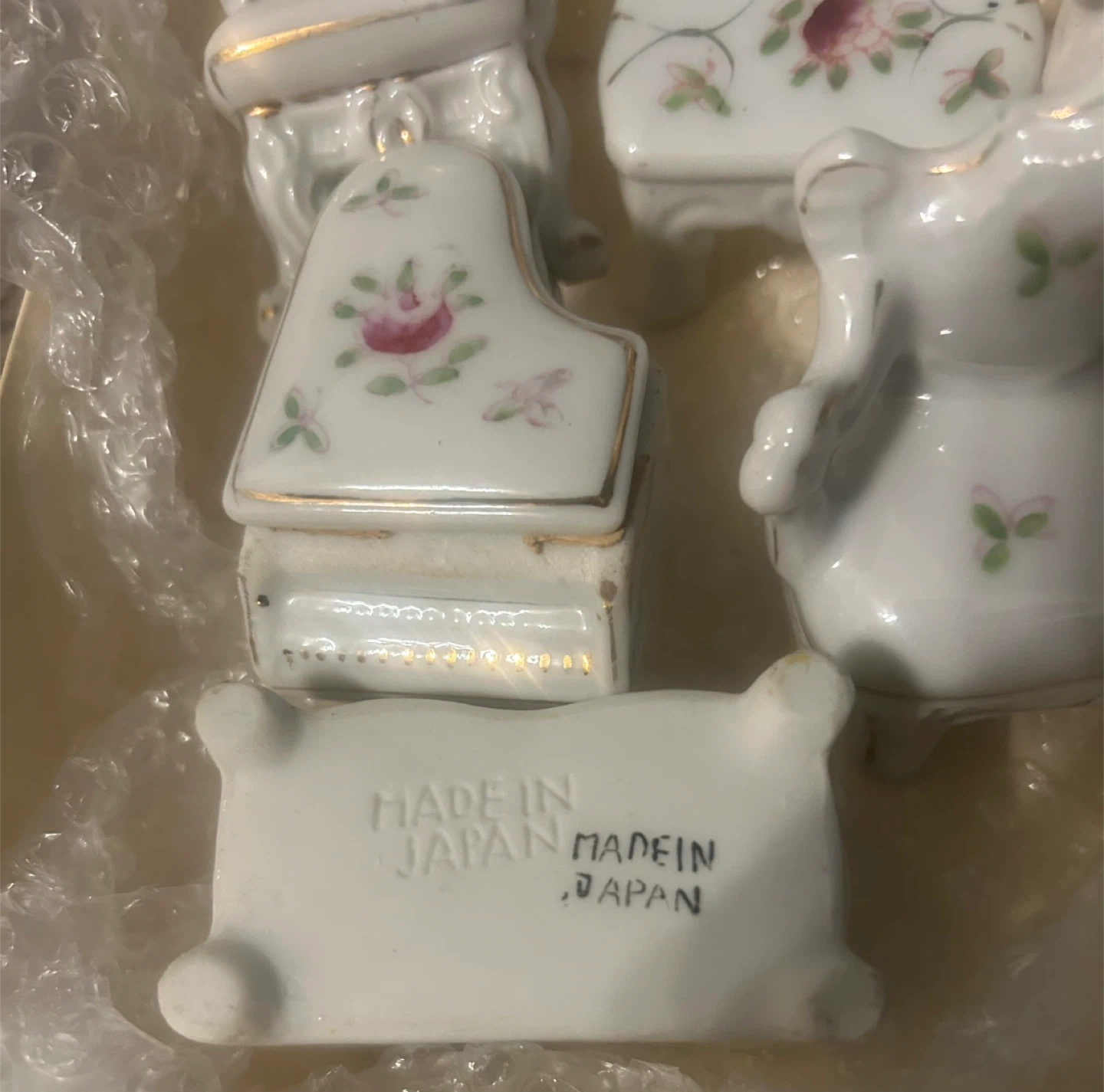 Here's a charming miniature furniture set, crafted in Japan from delicate porcelain. Each piece is adorned with a lovely floral design. The set includes a chair, sofa, piano, dresser, and table. Perfect for collectors or as a unique decorative item!