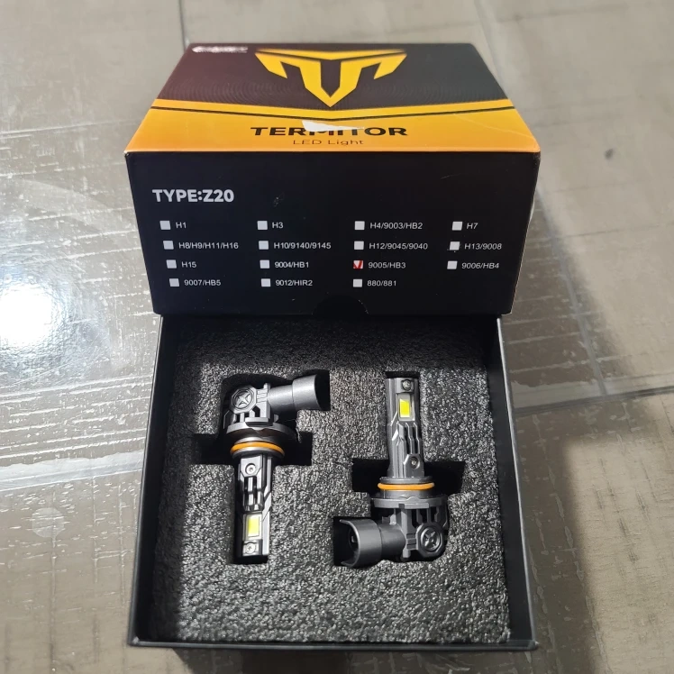 New set of Fahren 9005 LED Headlight Bulbs. They are 80,000LM 1200% Ultra-Bright, with a 1:1 Size Wireless HB3 design. These headlight bulbs feature 6500K Cool White light and are plug and play. They have a lifespan of 10 years, or 70000+ hours of non-stop lighting, and a silent turbofan for cooling. They are made with an all-in-one aviation aluminum body. The bulbs are designed to be 1200% brighter than halogen bulbs